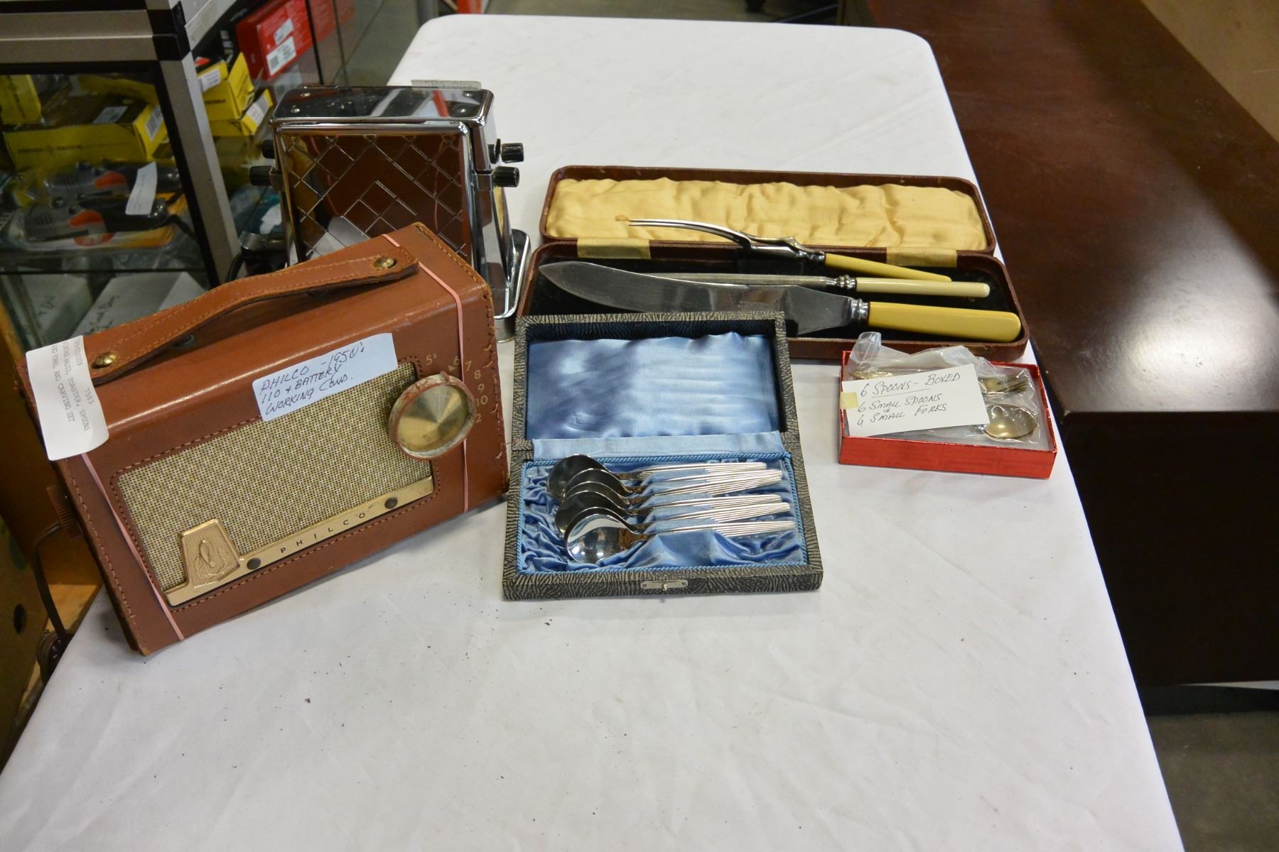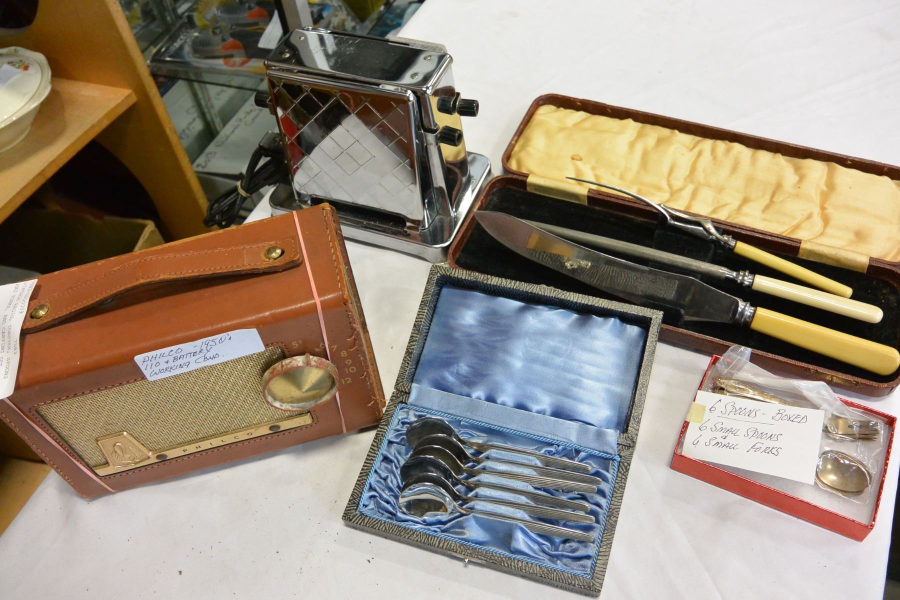 VINTAGE RADIO, TOASTER, SPOONS AND FORKS, AND CARVING SET
