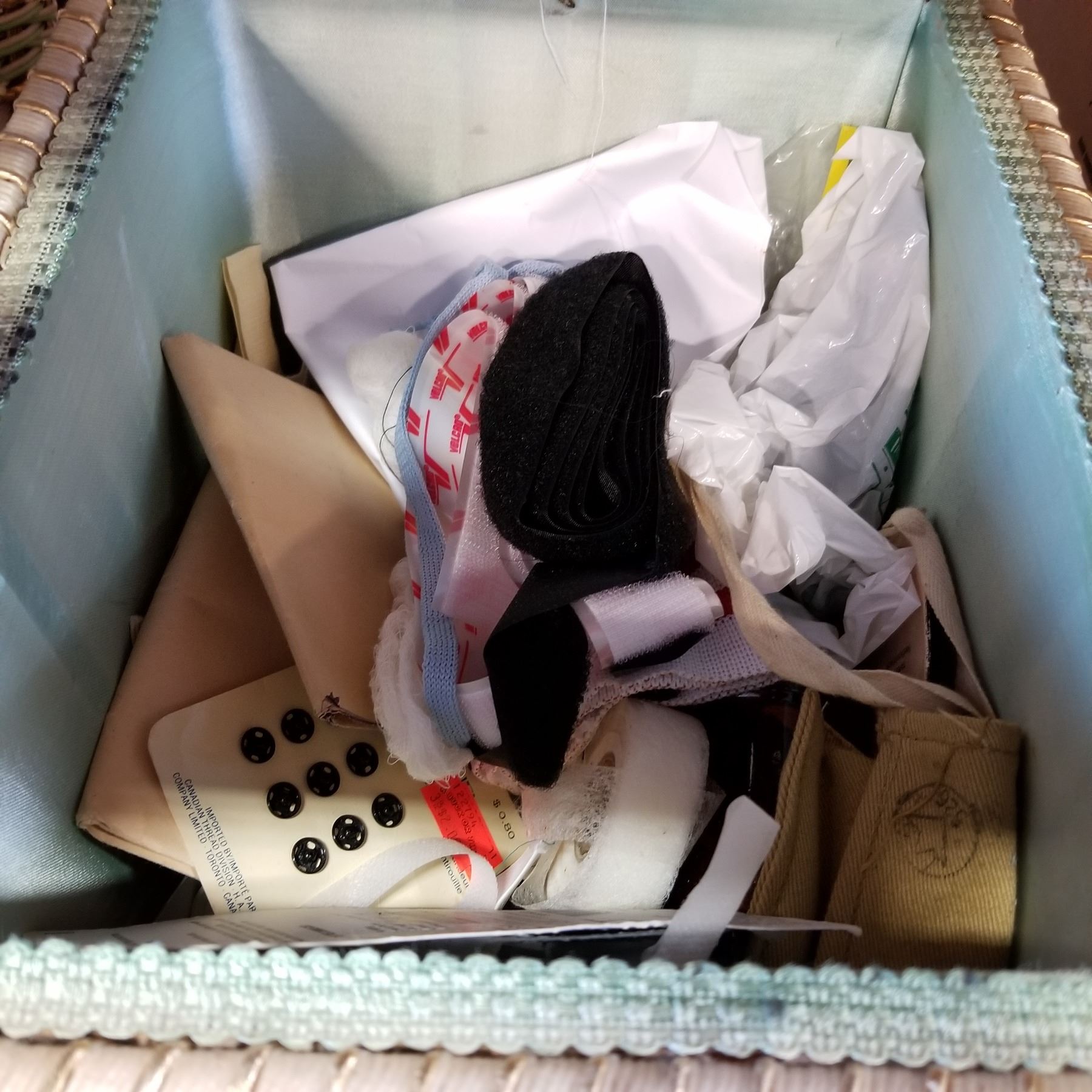 VINTAGE RATTAN AND GREEN TOP SEWING BASKET WITH CONTENTS