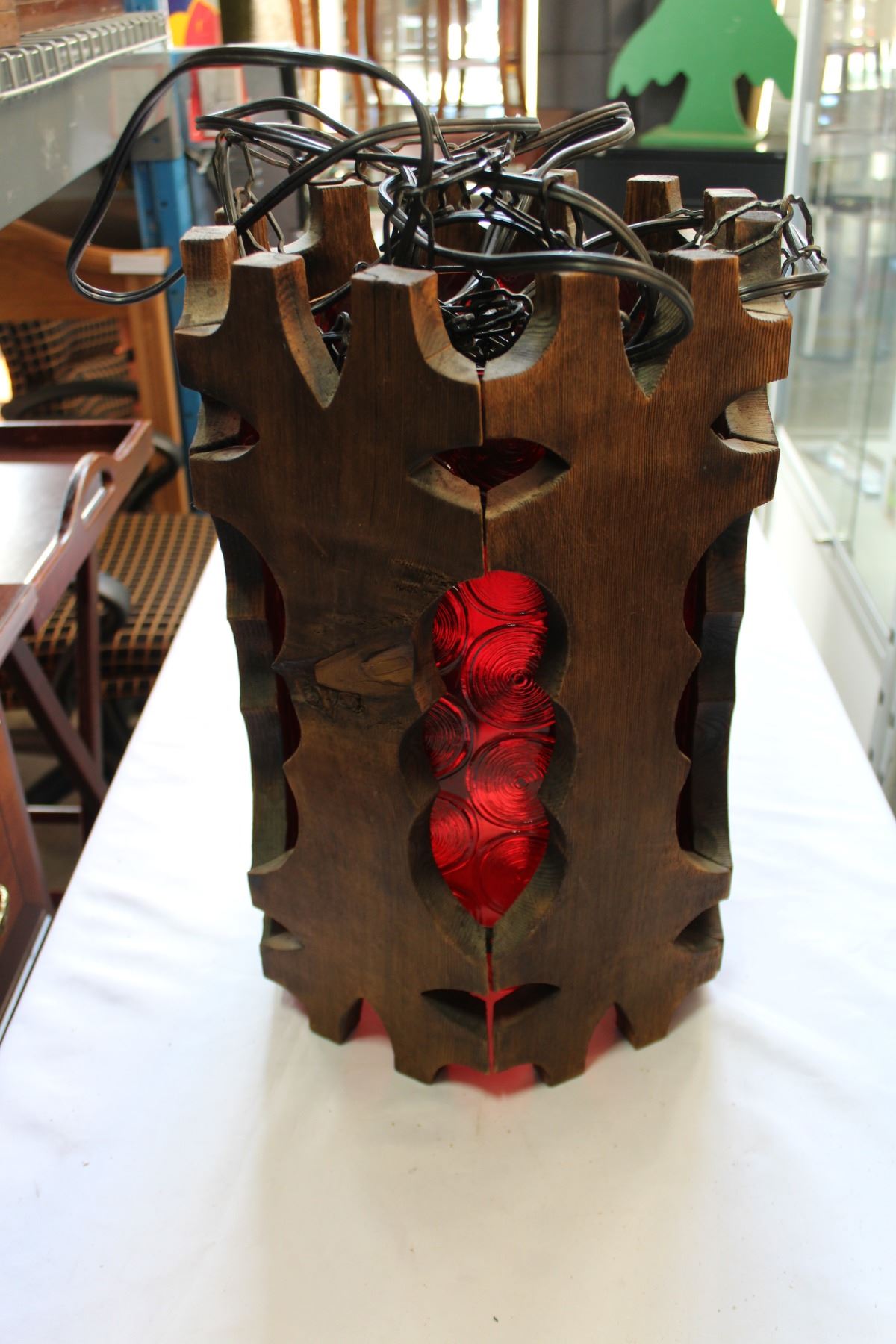VINTAGE RED GLASS AND WOOD LAMP