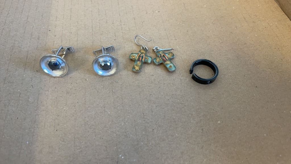 VINTAGE RING BAND, PAIR OF SILVER TONE AND BLACK STONE CUFF LINKS, AND VINTAGE 925 STERLING SILVER HOLY MARY CROSS DANGLE EARRINGS