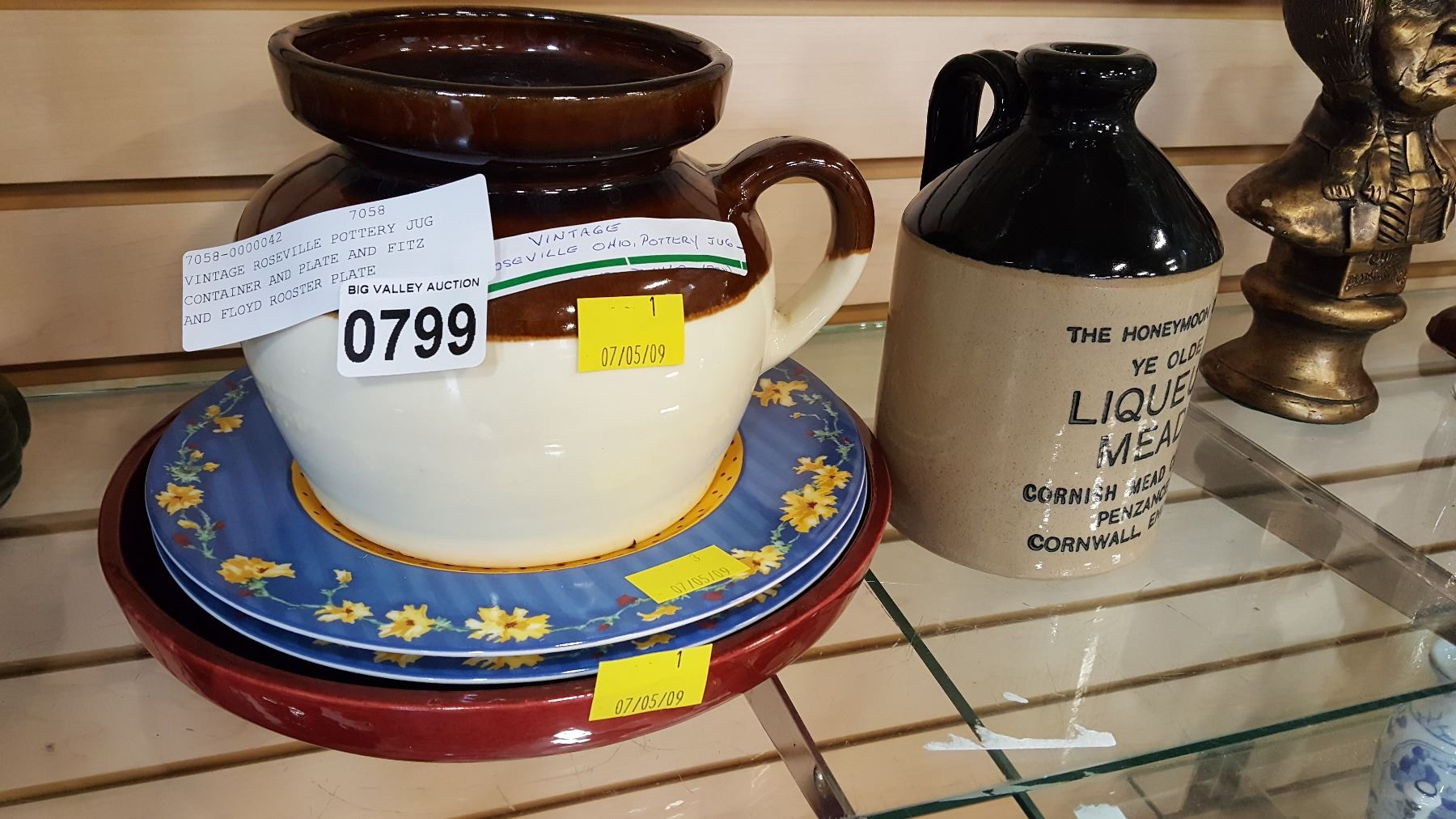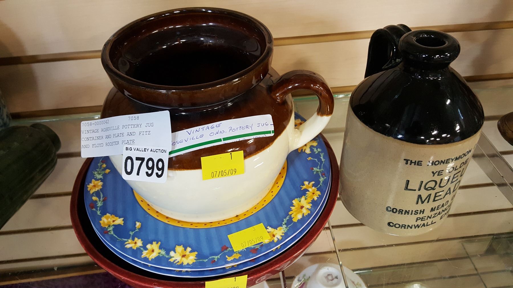 VINTAGE ROSEVILLE POTTERY JUG CONTAINER AND PLATE AND FITZ AND FLOYD ROOSTER PLATE