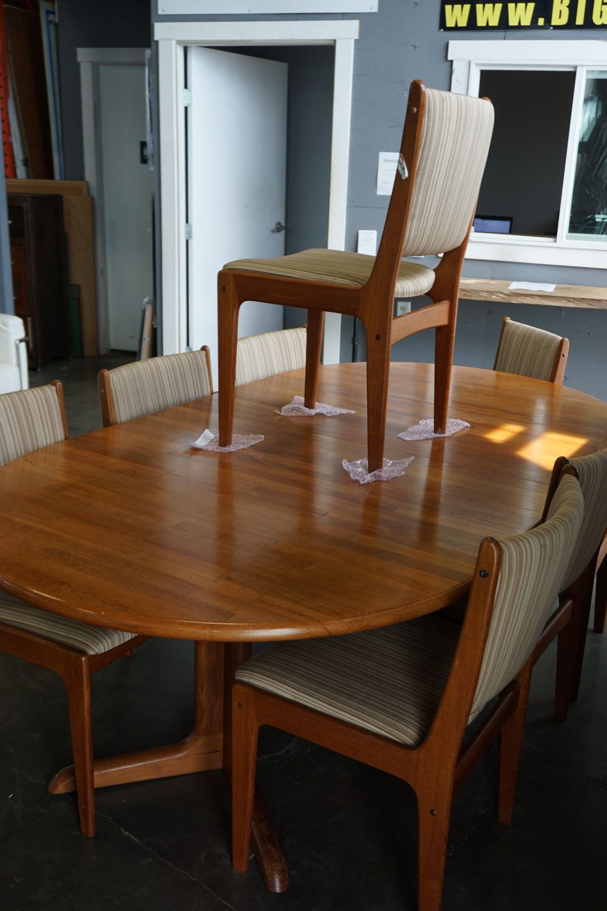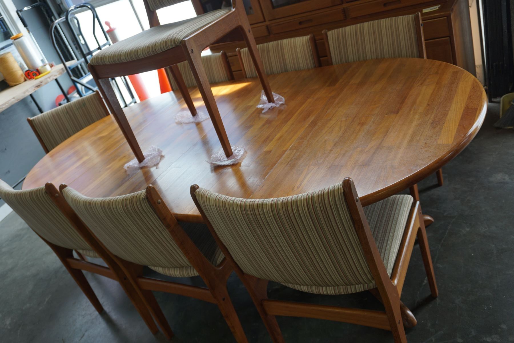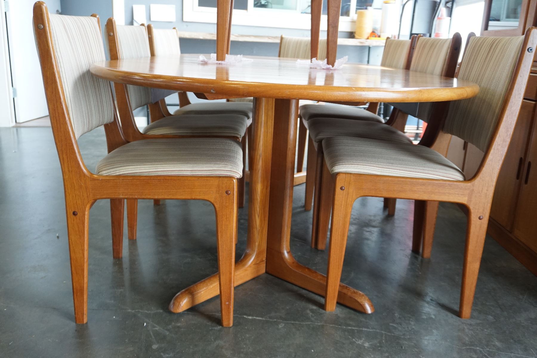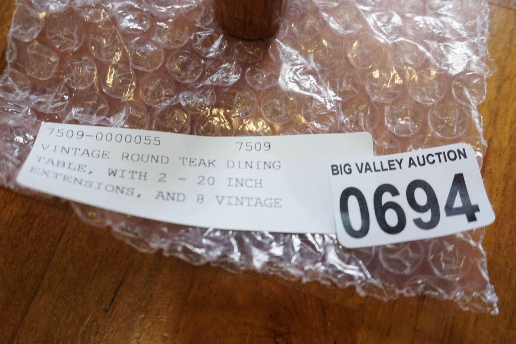 VINTAGE ROUND TEAK DINING TABLE, WITH 2 - 20 INCH EXTENSIONS, AND 8 VINTAGE UPHOLSTERED TEAK DINING