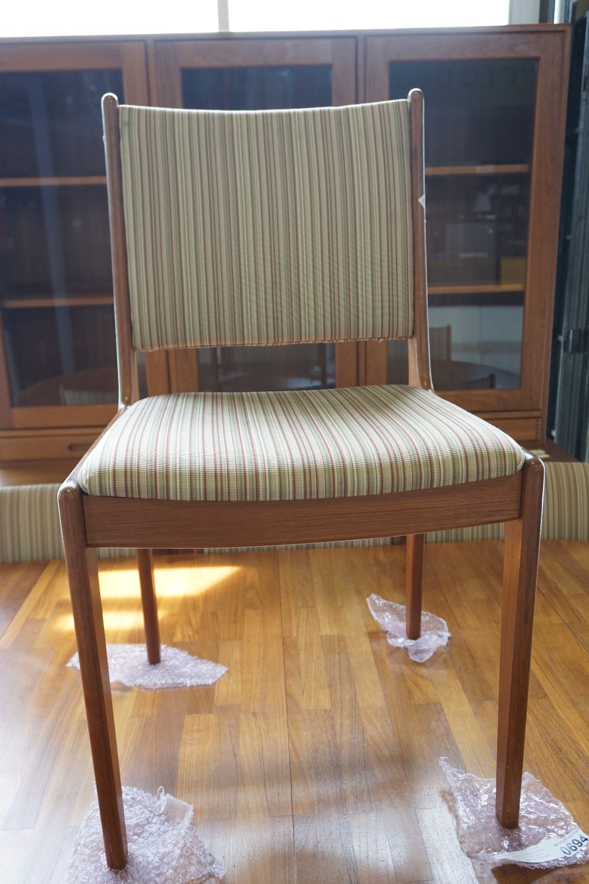 VINTAGE ROUND TEAK DINING TABLE, WITH 2 - 20 INCH EXTENSIONS, AND 8 VINTAGE UPHOLSTERED TEAK DINING CHAIRS