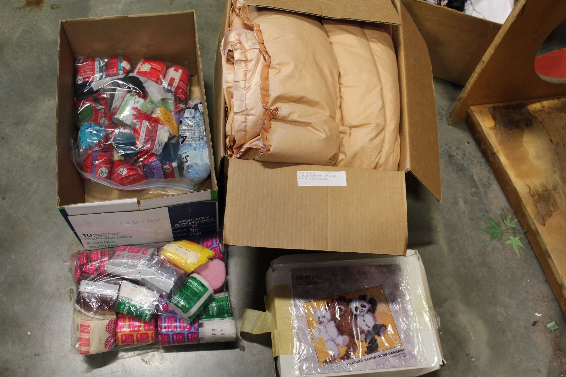 VINTAGE SATIN BED COVER AND BOX OF CRAFT SUPPLIES