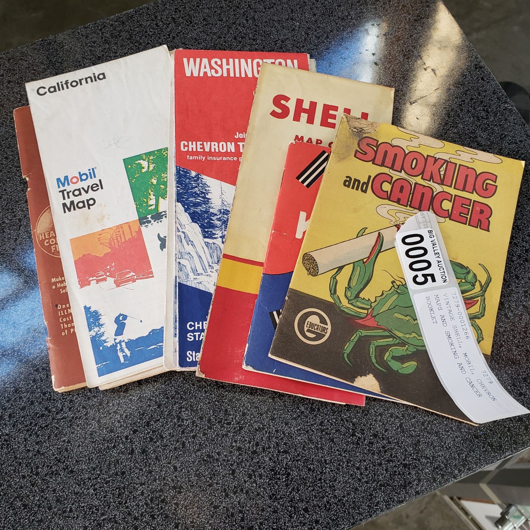 VINTAGE SHELL, MOBIL, CHEVRON MAPS AND SMOKING AND CANCER BOOKLET