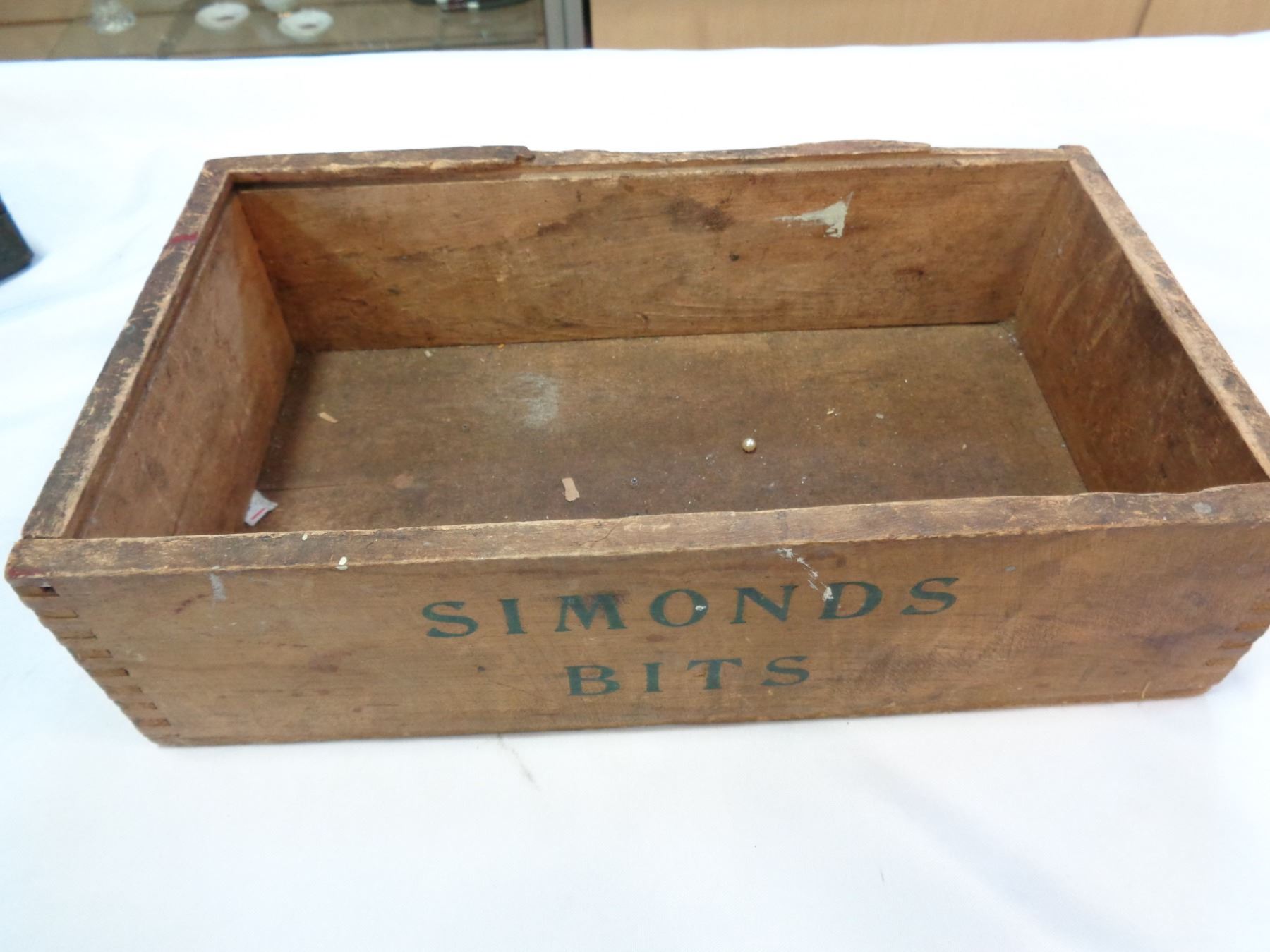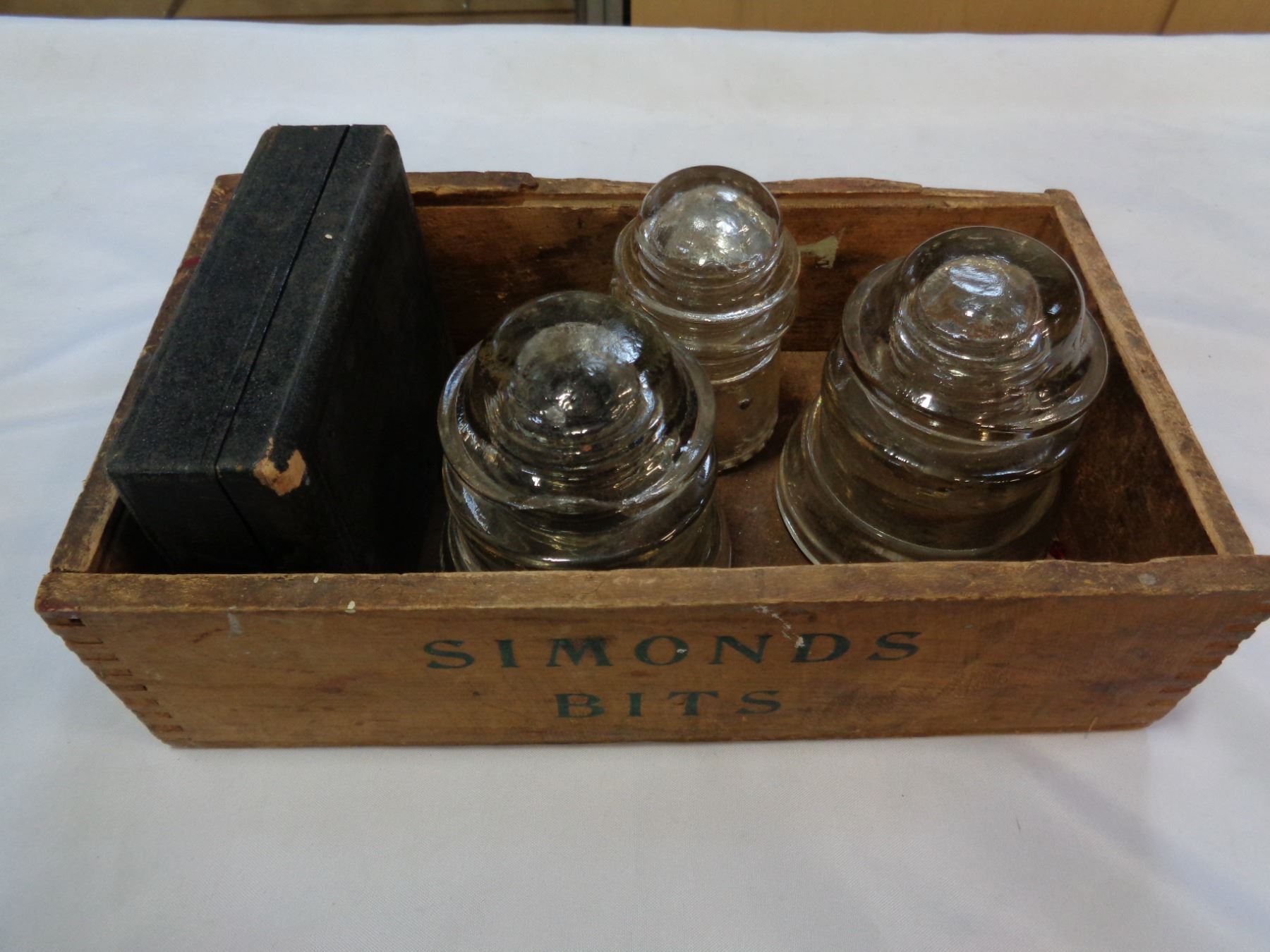 VINTAGE SIMONDS BIT WOOD BOX W/ 3 INSULATORS AND VINTAGE GAUGE