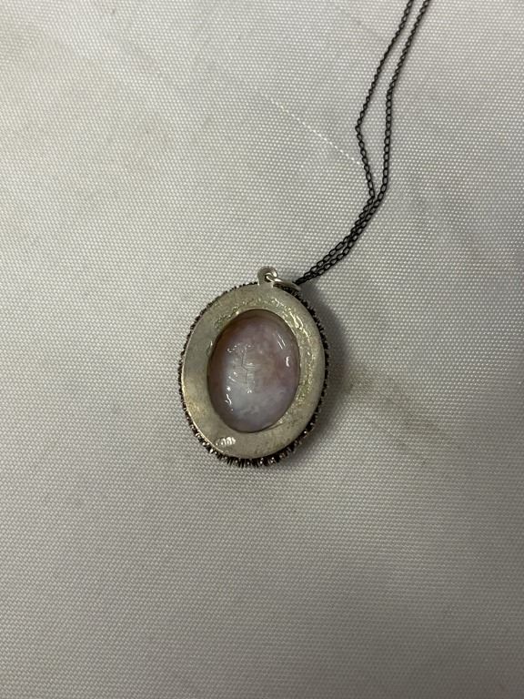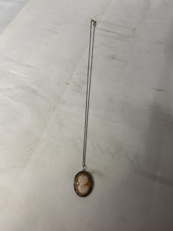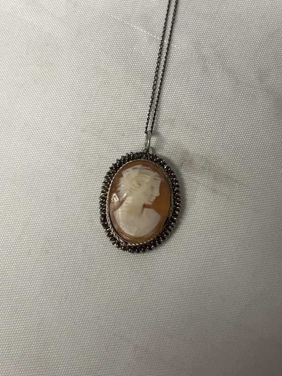 VINTAGE STERLING SILVER W/ HAND CARVED SHELL CAMEO PENDANT W/ CHAIN NECKLACE