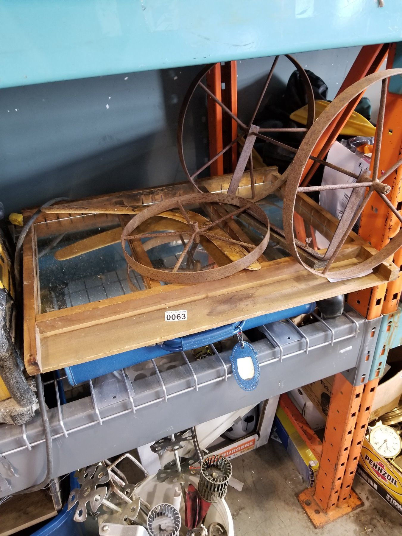 VINTAGE SUITCASE, MIRROR, BOOMERANG, AND WHEELS