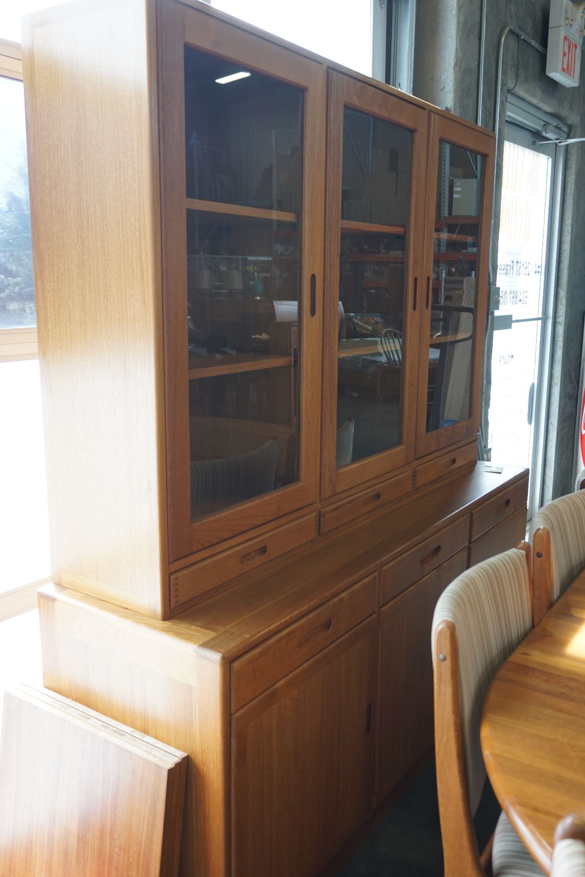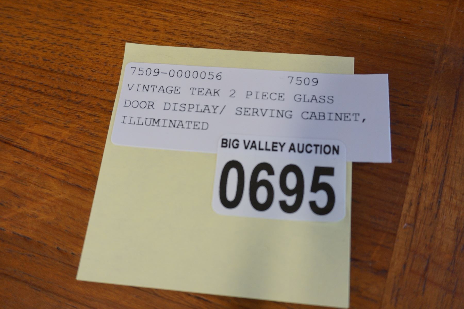VINTAGE TEAK 2 PIECE GLASS DOOR DISPLAY/ SERVING CABINET, ILLUMINATED