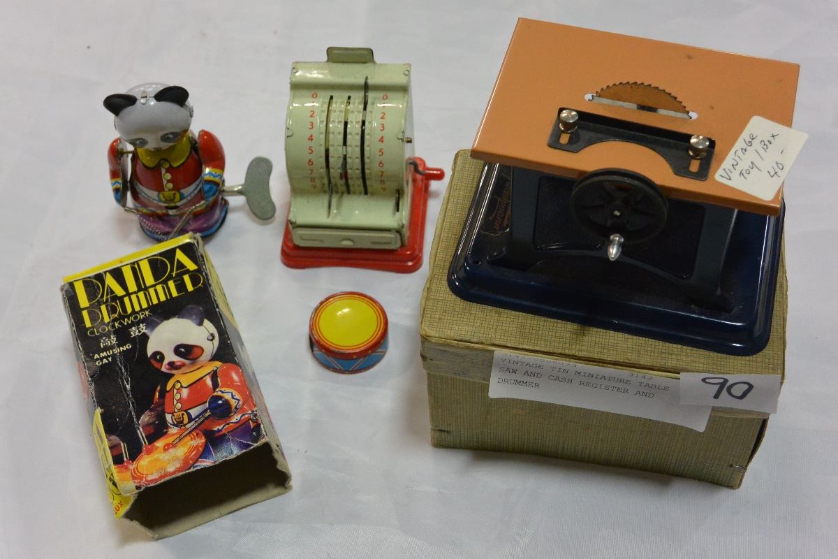 VINTAGE TIN MINIATURE TABLE SAW AND CASH REGISTER AND