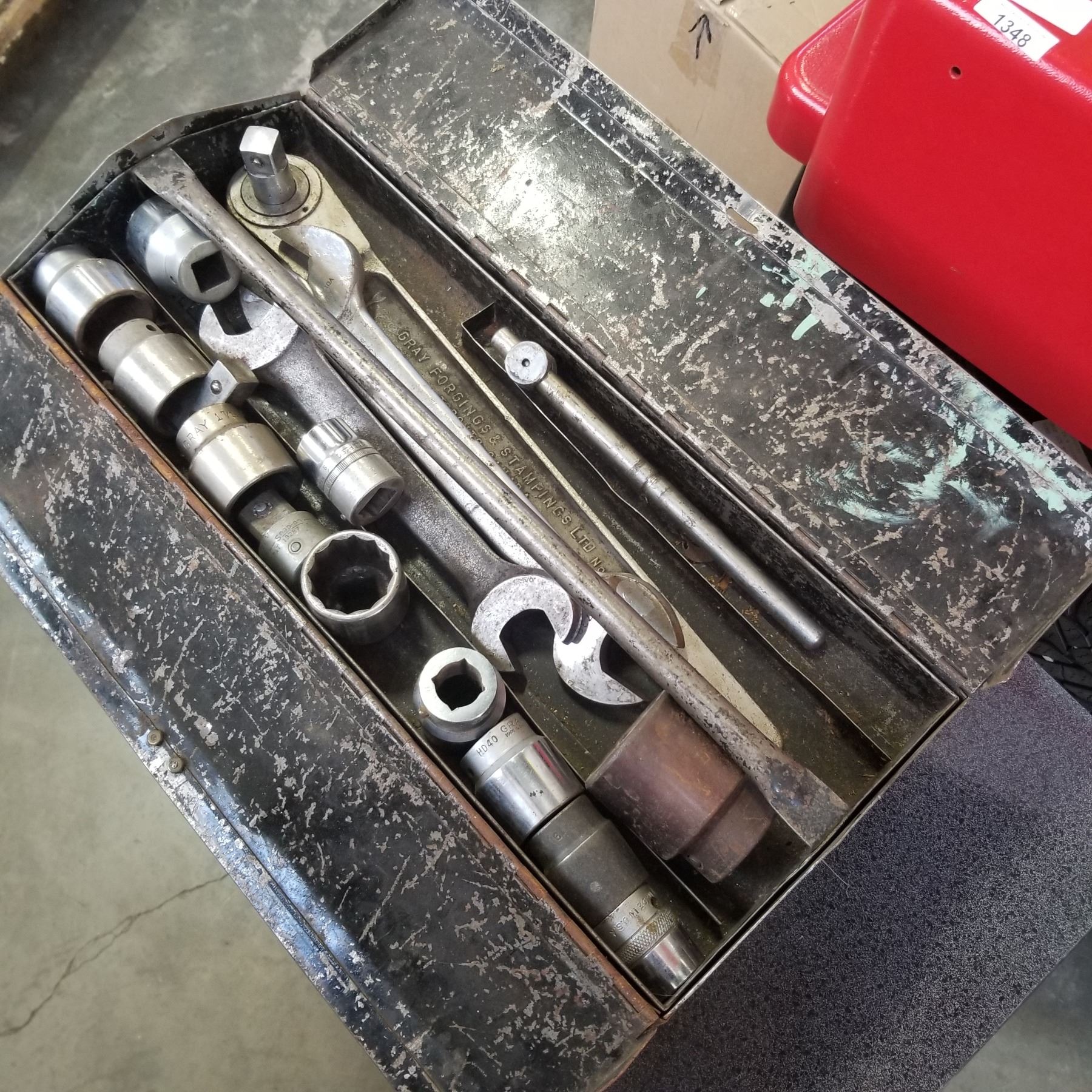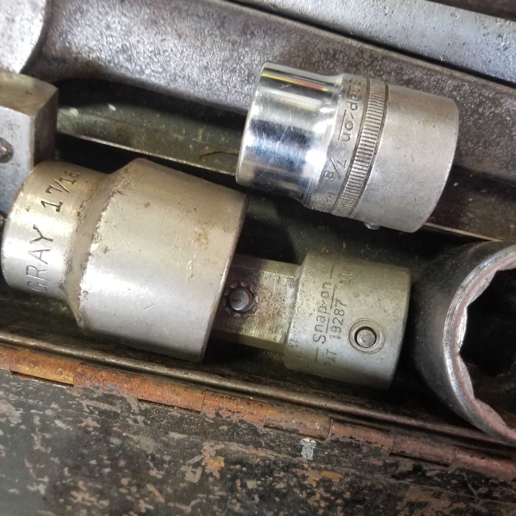 VINTAGE TOOL BOX WITH VINTAGE SNAP ON AND GREY SOCKETS AND 2 WRENCHES 18 PCS TOTAL