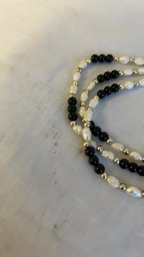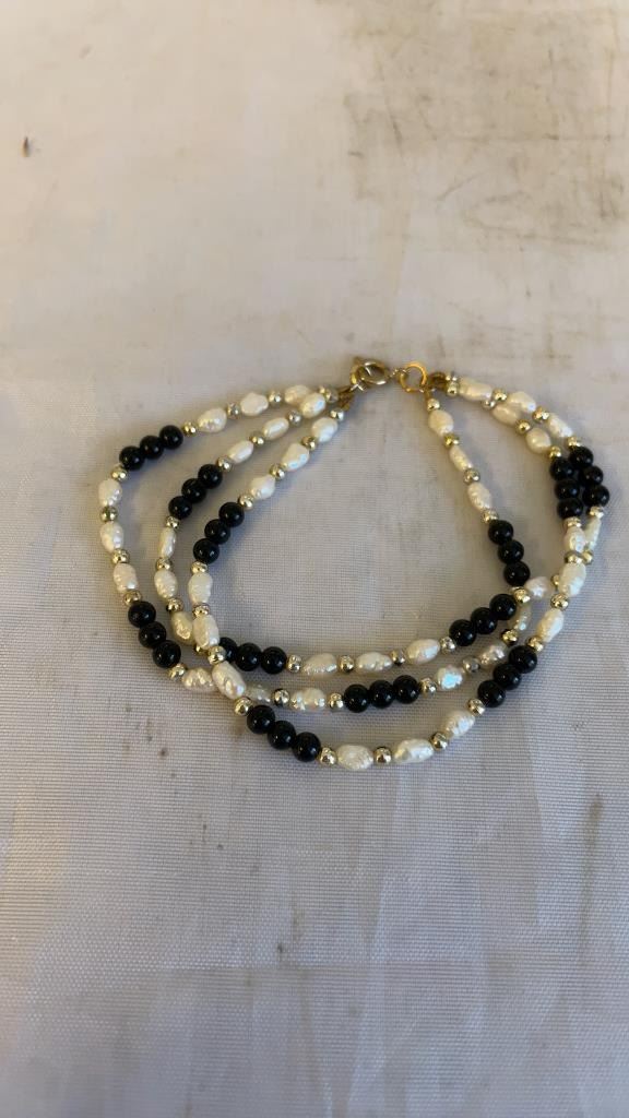 VINTAGE TRIPLE STRAND GENUINE FRESHWATER PEARLS AND BLACK BEADS BRACELET