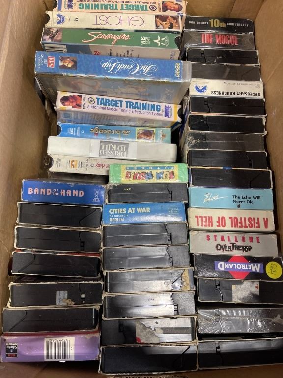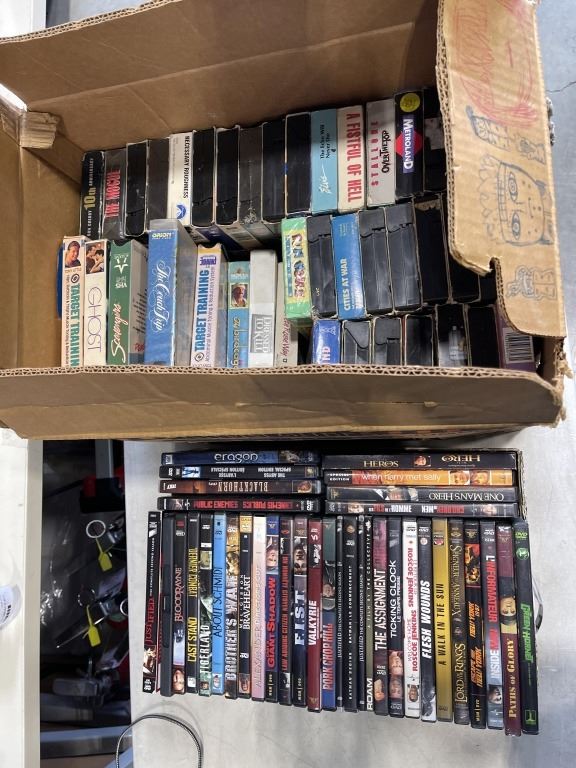 VINTAGE VHS TAPES AND TRAY OF DVDS