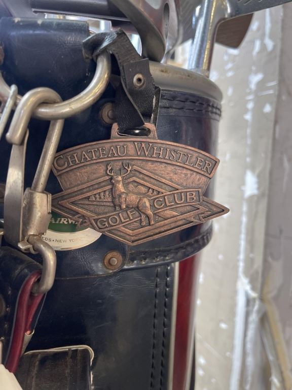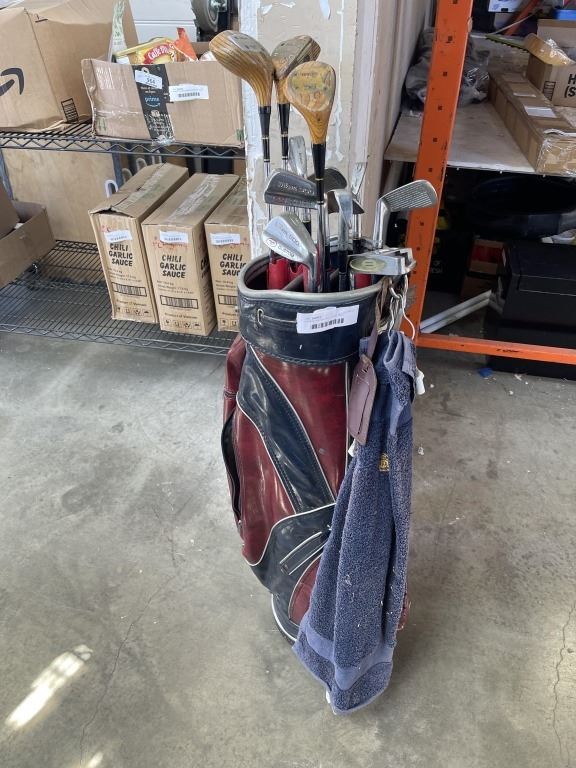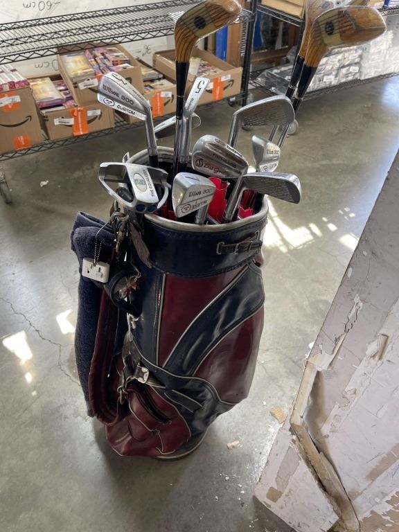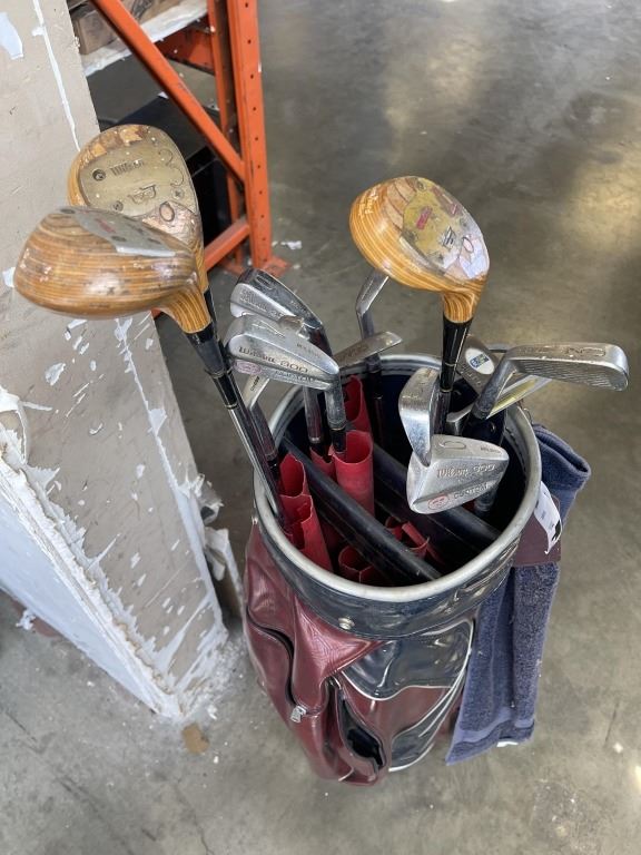 VINTAGE WILSON GOLF CLUBS AND WOODEN DRIVERS, IN LEATHER BAG