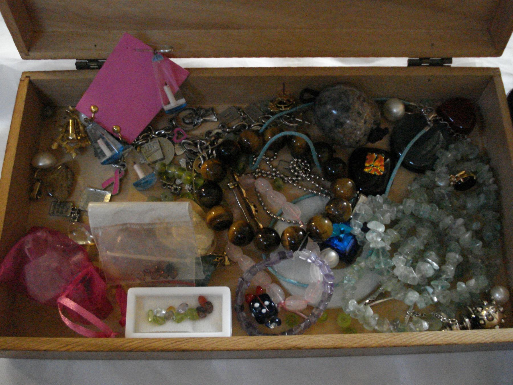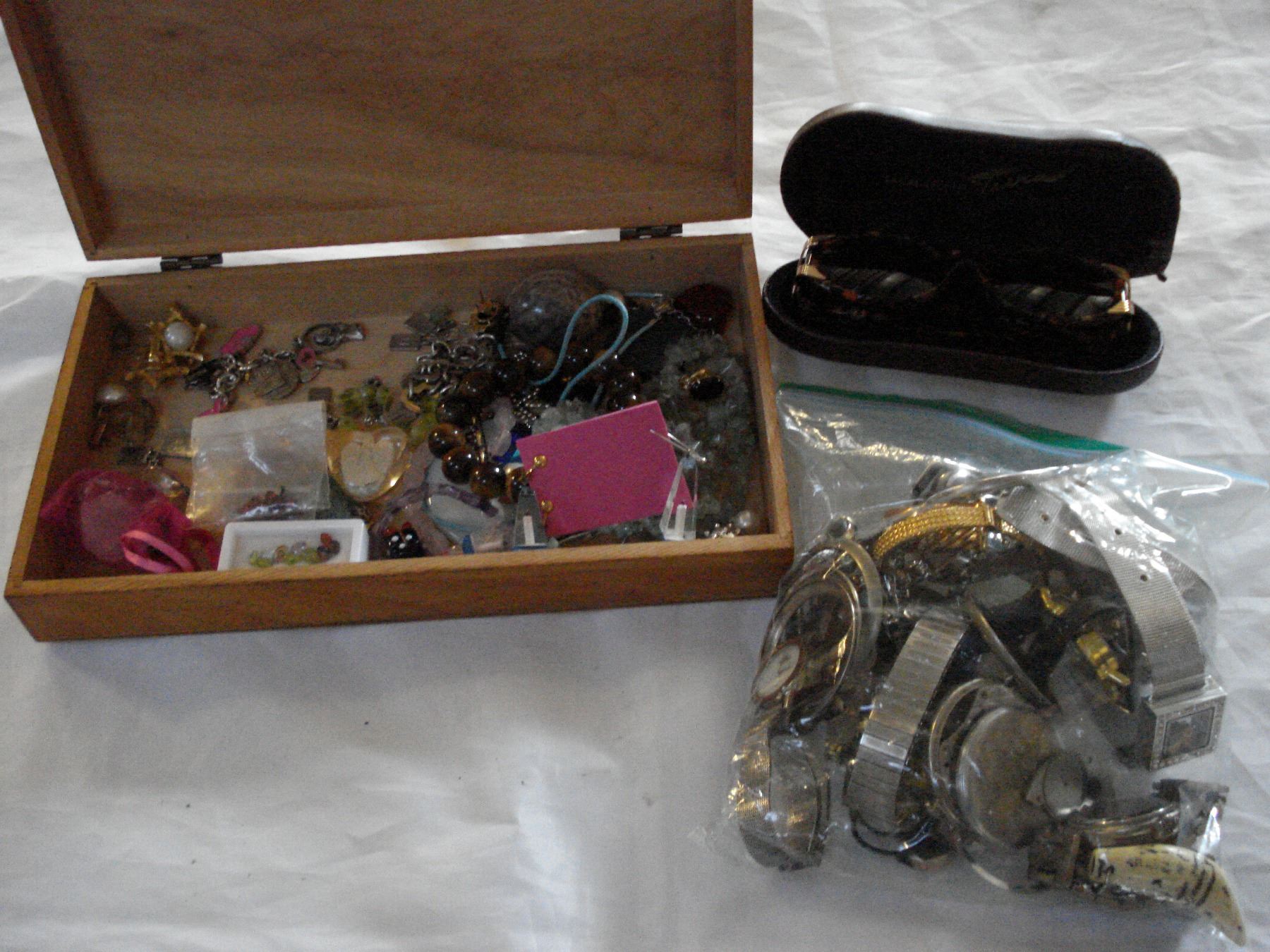 VINTAGE WOOD DRESSER BOX AND BAG OF ESTATE WATCHES