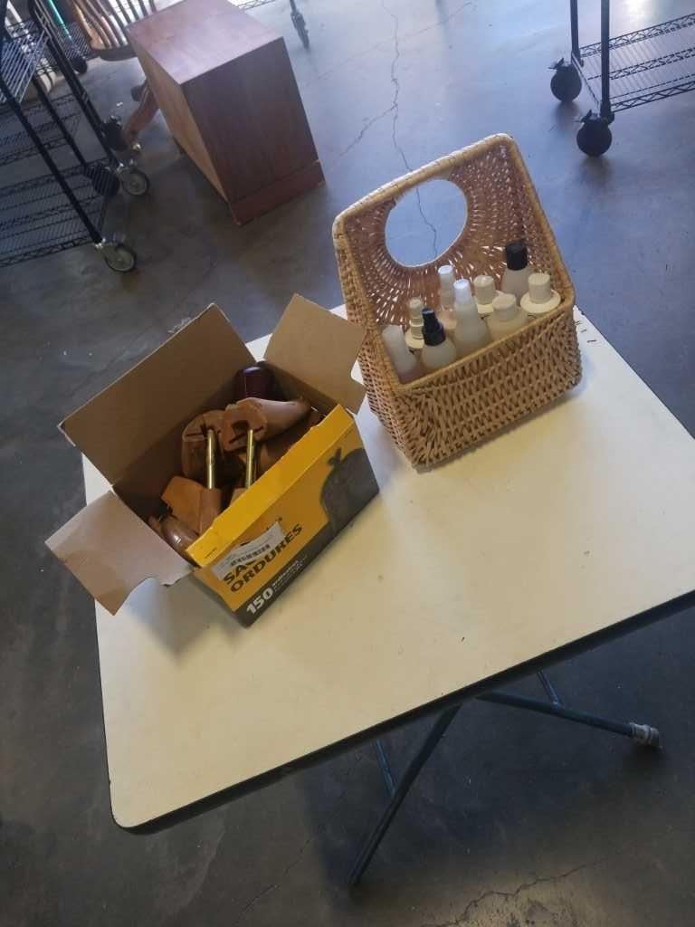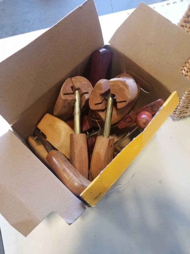 VINTAGE WOOD SHOE HORNS AND BASKET OF WIG CARE ITEMS