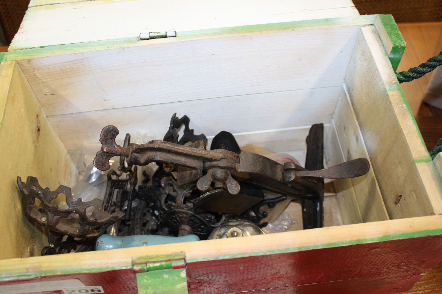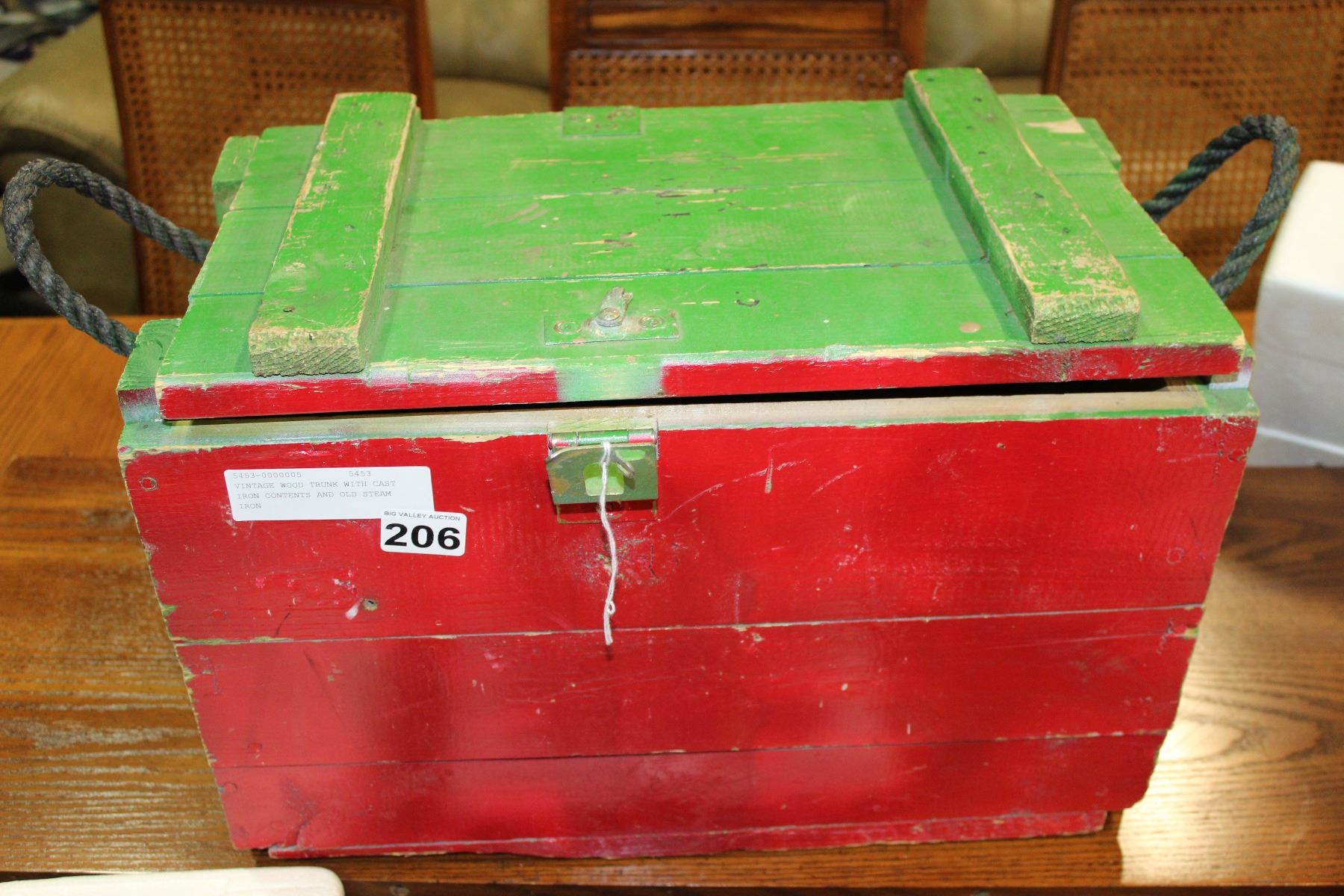 VINTAGE WOOD TRUNK WITH CAST IRON CONTENTS AND OLD STEAM IRON