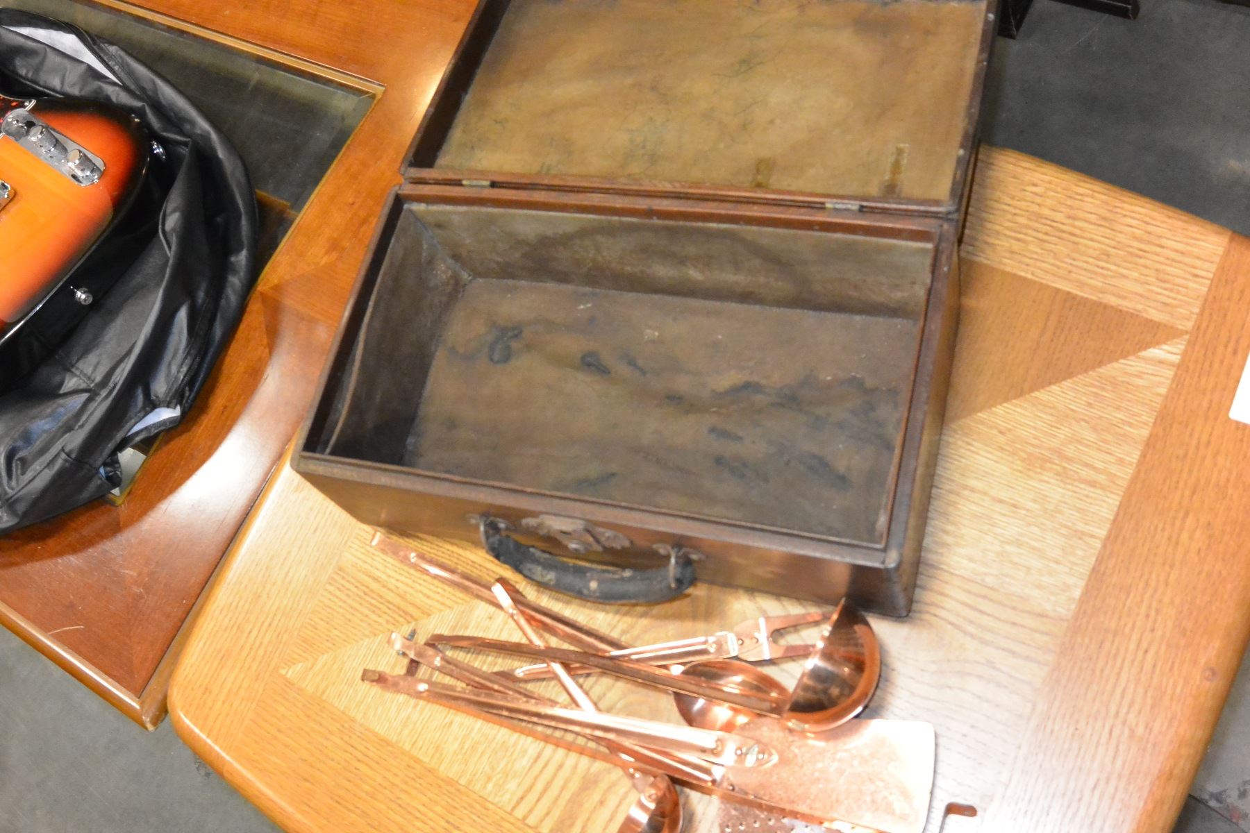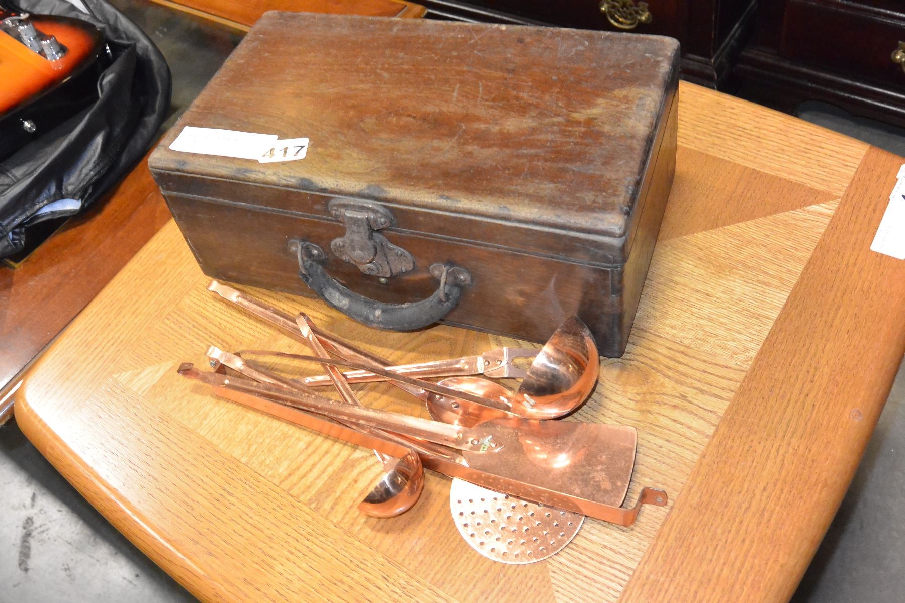 VINTAGE WOODEN BOX AND COPPER SERVING PIECES