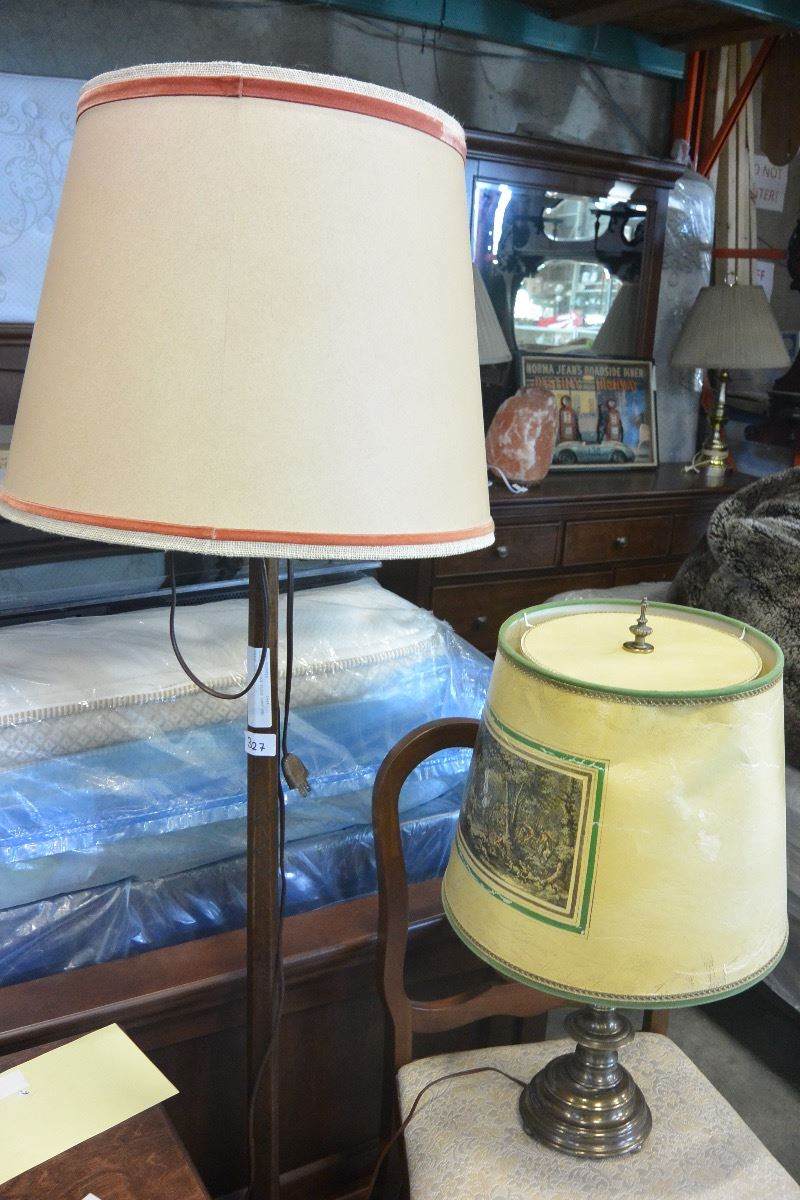 VINTAGE WOODEN FLOOR LAMP AND BRASS TABLE