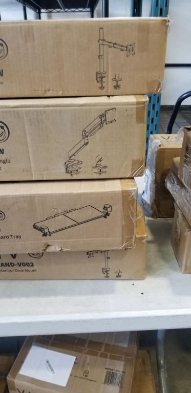 VIVO DOUBLE MONITOR DESK MOUNT, KEYBOARD TRAY AND SINGLE MONITOR DESK MOUNT, AND SINGLE MONITOR ADJUSTABLE DESK MOUNT, 4PC LOT