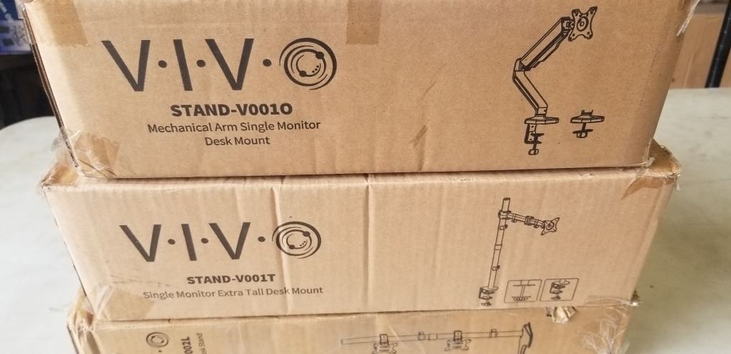 VIVO DUAL MONITOR DESK STAND, VIVO MECHANICAL ARM SINGLE MONITOR DESK MOUNT, AND VIVO SINGLE MONITOR EXTRA TALL DESK MOUNT