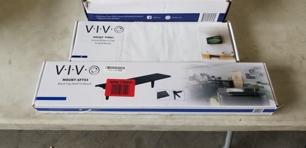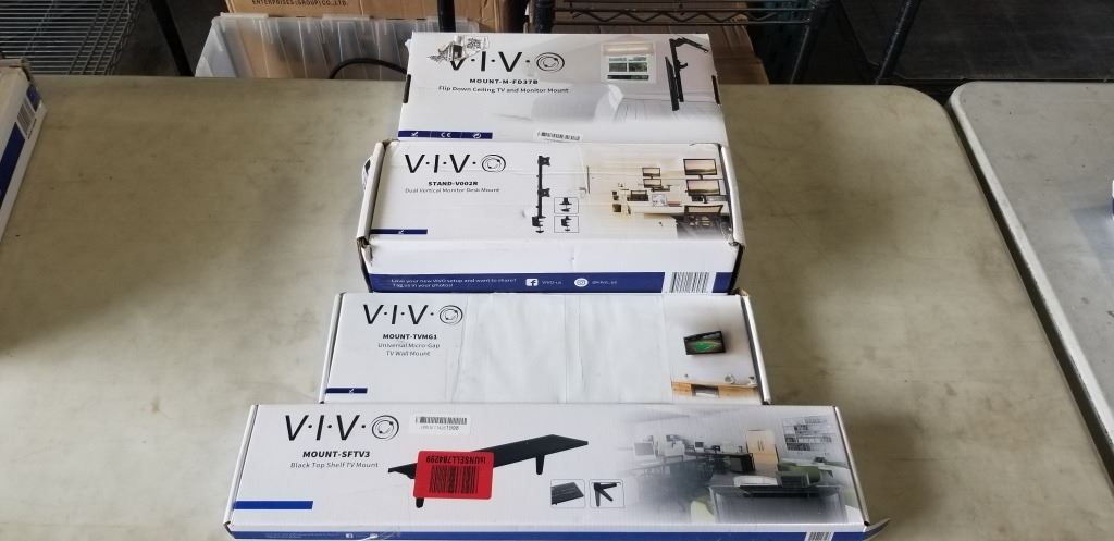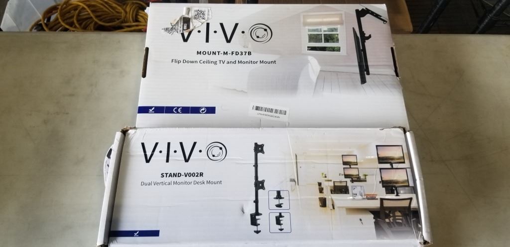 VIVO FLIP DOWN CEILING TV AND MONITOR MOUNT, DUAL VERTICAL MONITOR DESK MOUNT, MICRO GAP TV WALL MOUNT AND TV TOP SHELF