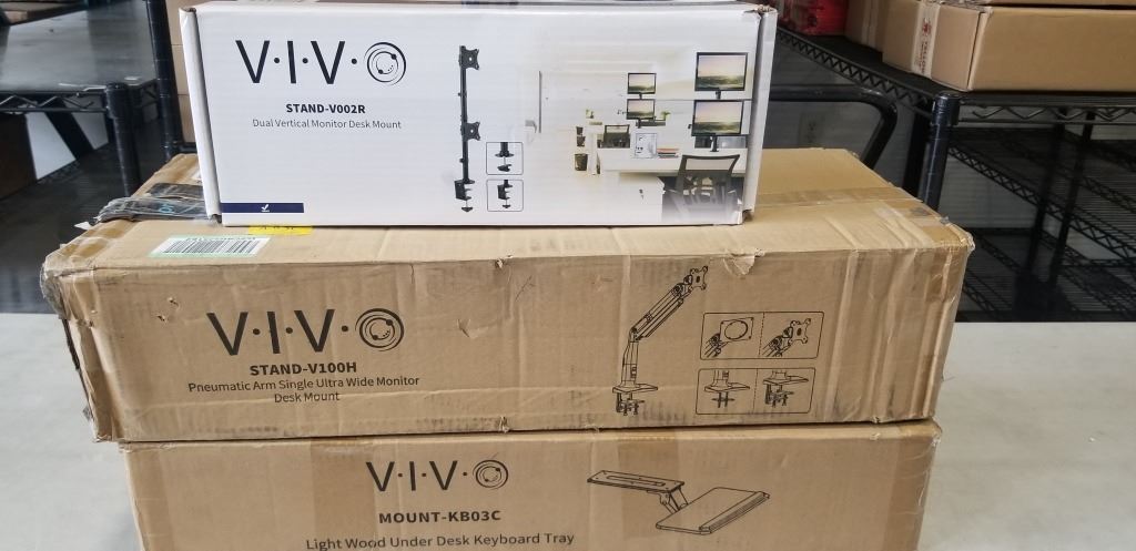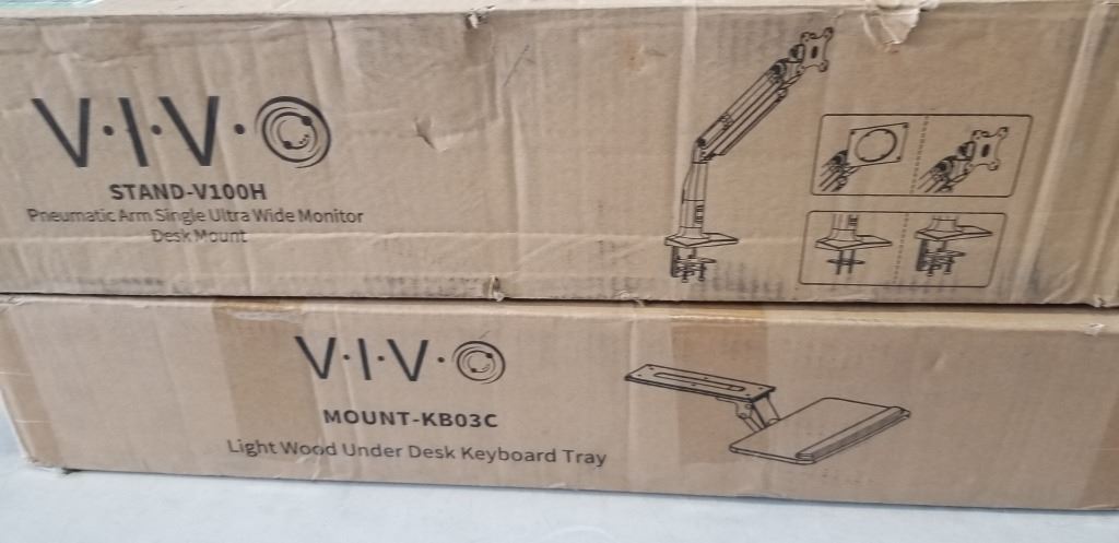 VIVO PNEUMATIC ARM SINGLE ULTRA WIDE MONITOR DESK MOUNT, VIVO DUAL VERTICAL MONITOR DESK MOUNT, AND UNDER DESK KEYBOARD TRAY