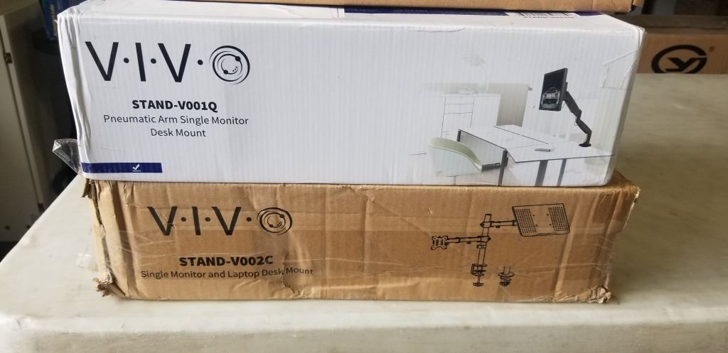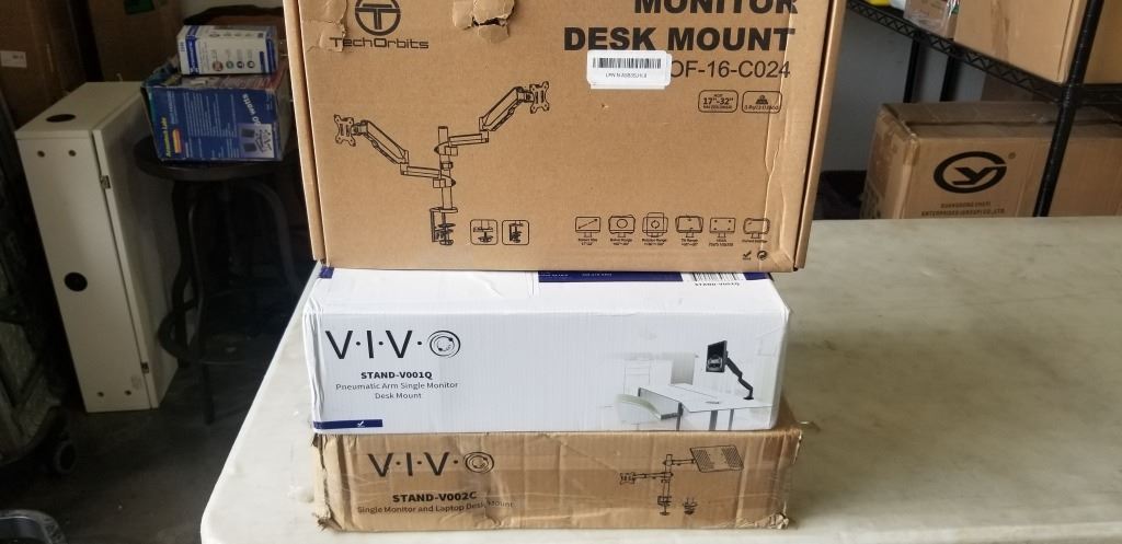 VIVO PNEUMTAIC ARM SINGLE MONITOR DESK MOUNT, TECH ORBITS DUAL MONITOR ADJUSTABLE DESK MOUNT, AND VI