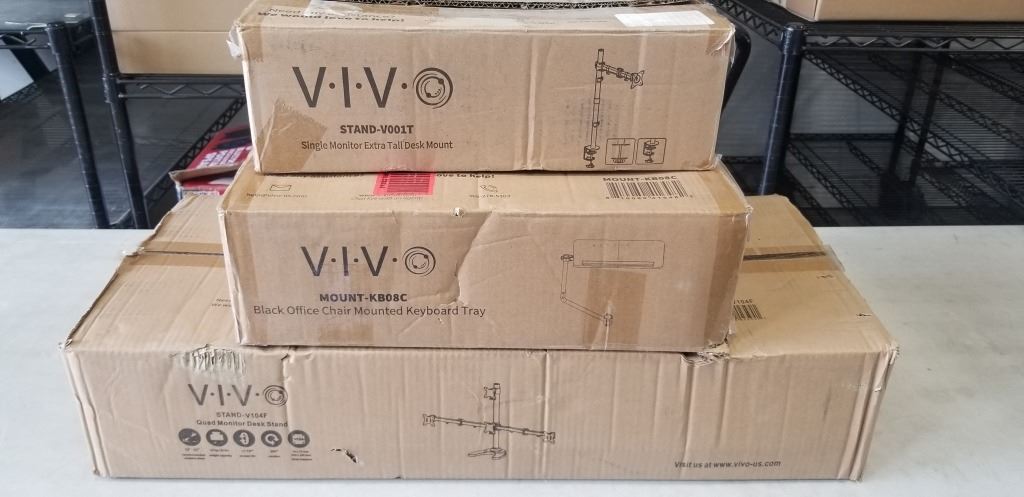 VIVO QUAD MONITOR DESK STAND, VIVO OFFICE CHAIR MOUNTED KEYBOARD TRAY, AND SINGLE MONITOR EXTRA TALL DEKS MOUNT