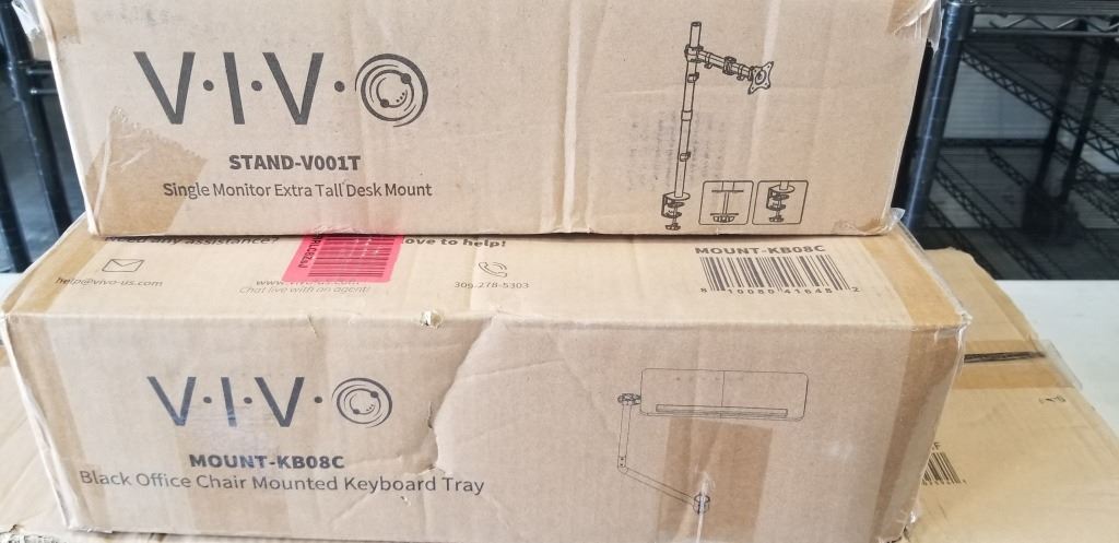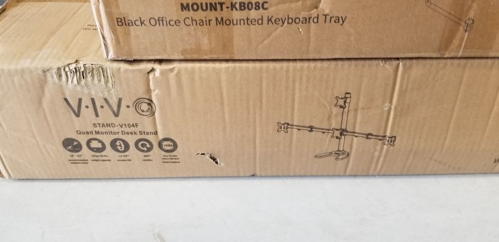 VIVO QUAD MONITOR DESK STAND, VIVO OFFICE CHAIR MOUNTED KEYBOARD TRAY, AND SINGLE MONITOR EXTRA TALL