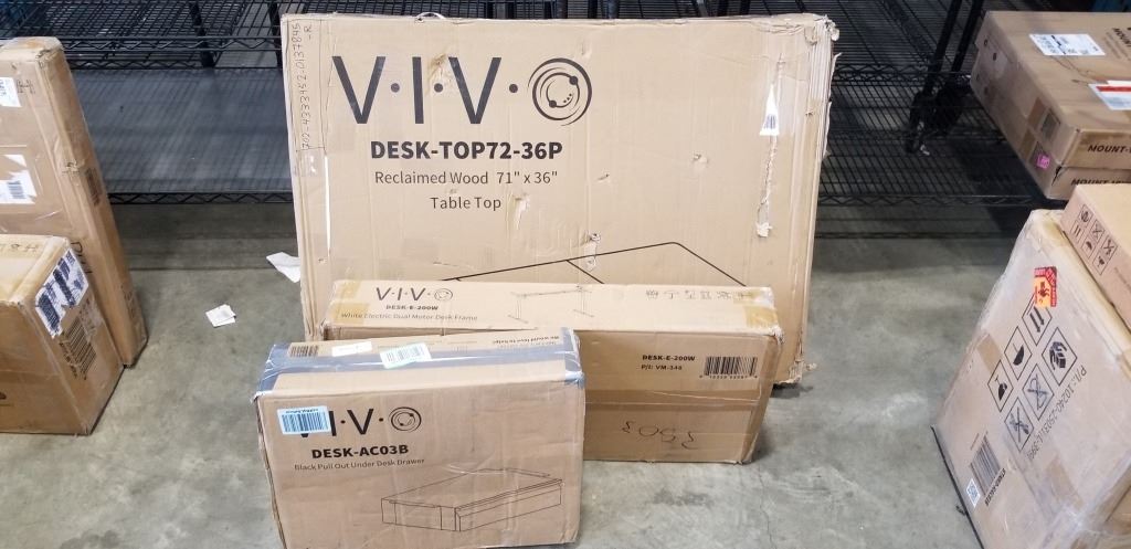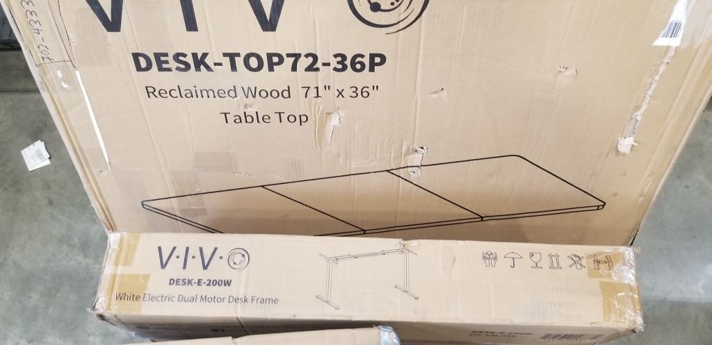 VIVO RECLAIMED 71" X 36" TABLE TOP AND WHITE ELECTRIC DUAL MOTOR DESK FRAME AND BLACK PULL OUT UNDER DESK DRAWER