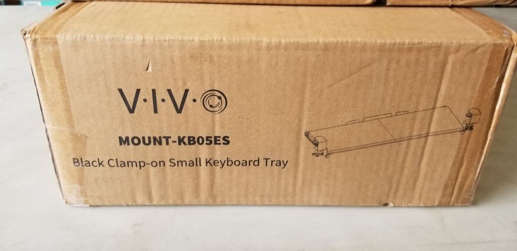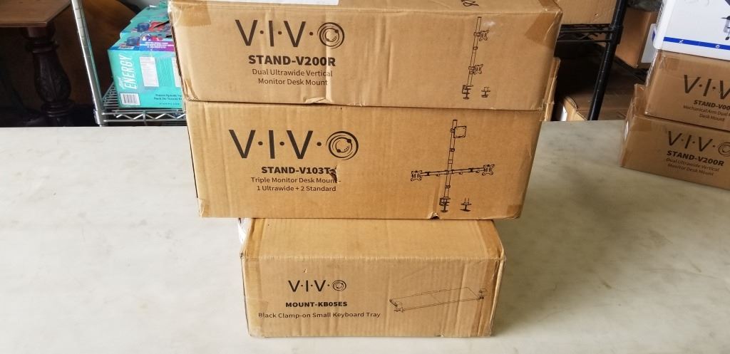 VIVO TRIPLE MONITOR DESK MOUNT, DUAL ULTRAWIDE VERTICAL MONITOR DESK MOUNT, AND BLACK CLAMP ON SMALL KEYBOARD TRAY