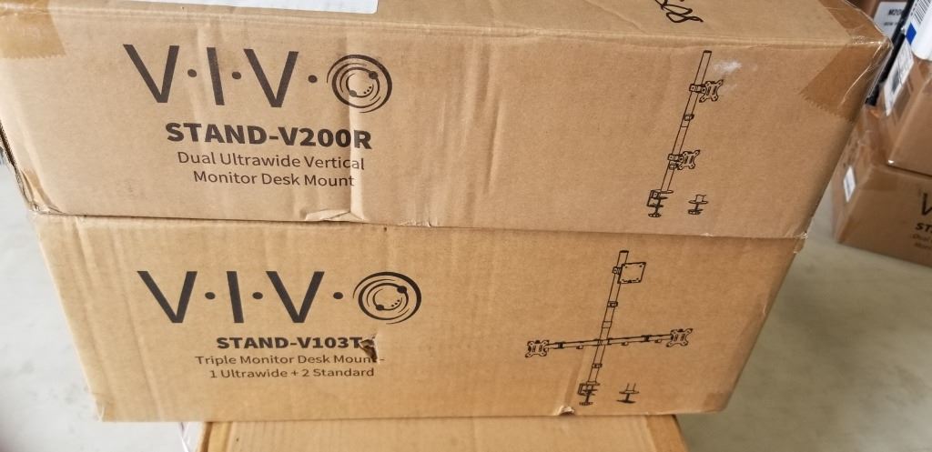 VIVO TRIPLE MONITOR DESK MOUNT, DUAL ULTRAWIDE VERTICAL MONITOR DESK MOUNT, AND BLACK CLAMP ON SMALL