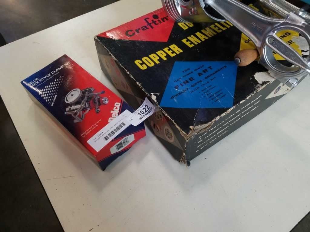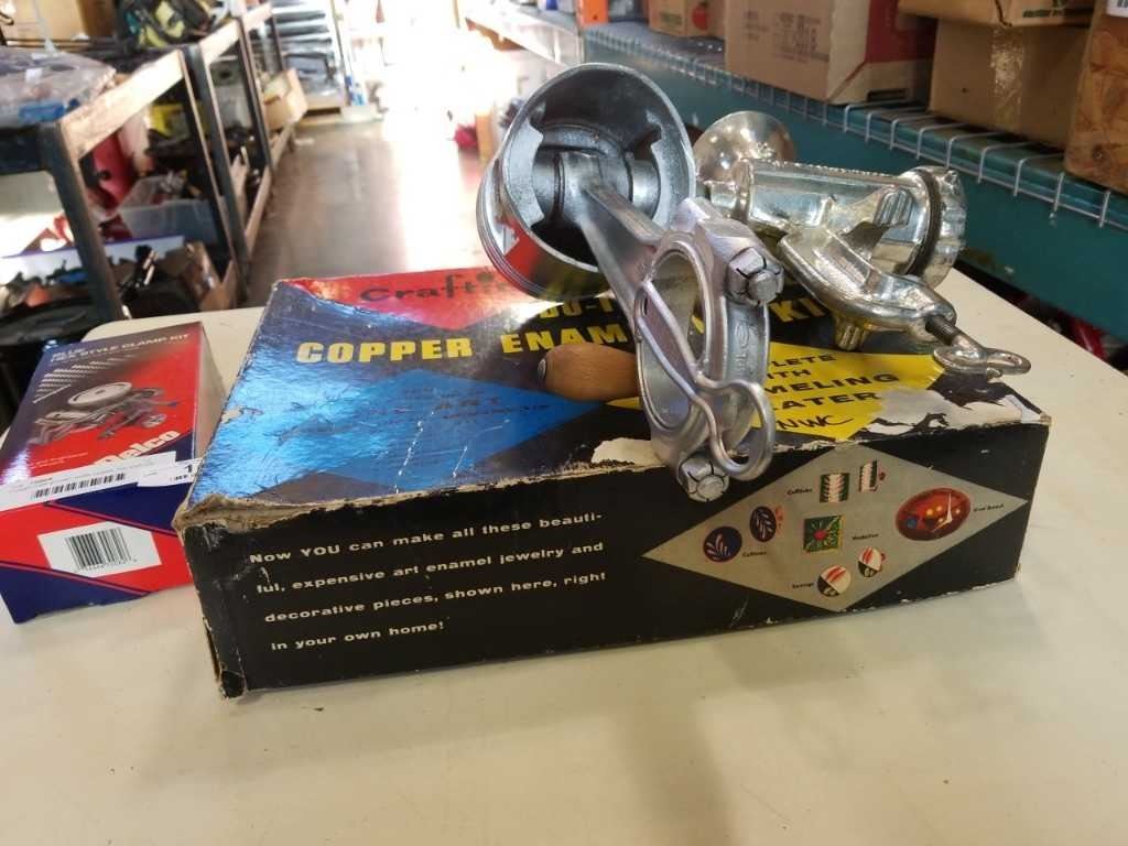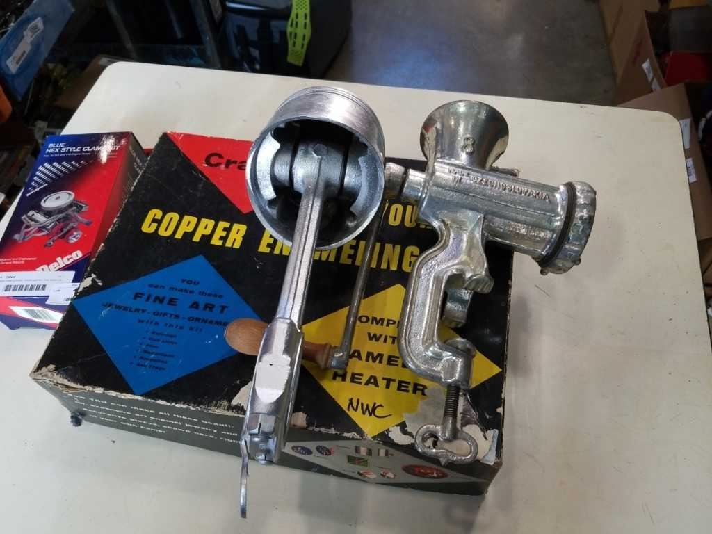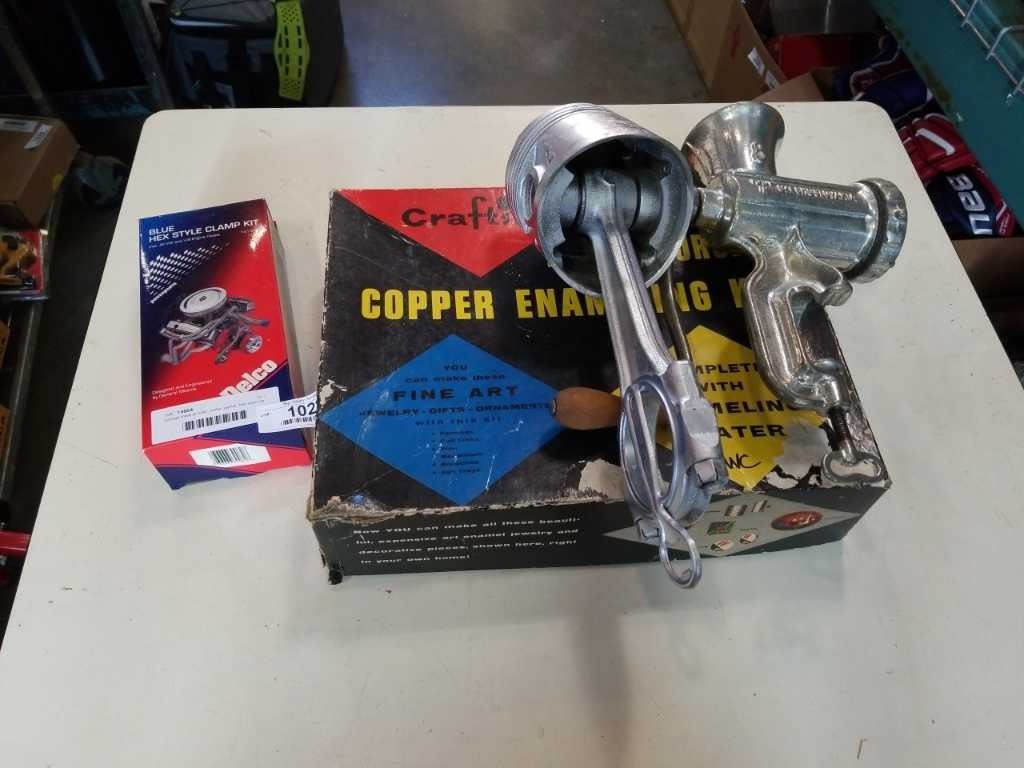 Vintage meat grinder, bottle opener, hex style clamp kit and copper enameling kit