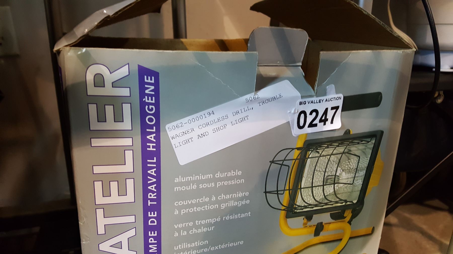 WAGNER CORDLESS DRILL, TROUBLE LIGHT AND SHOP LIGHT