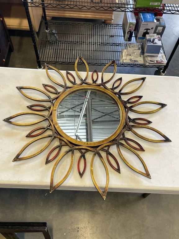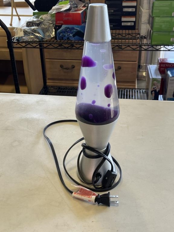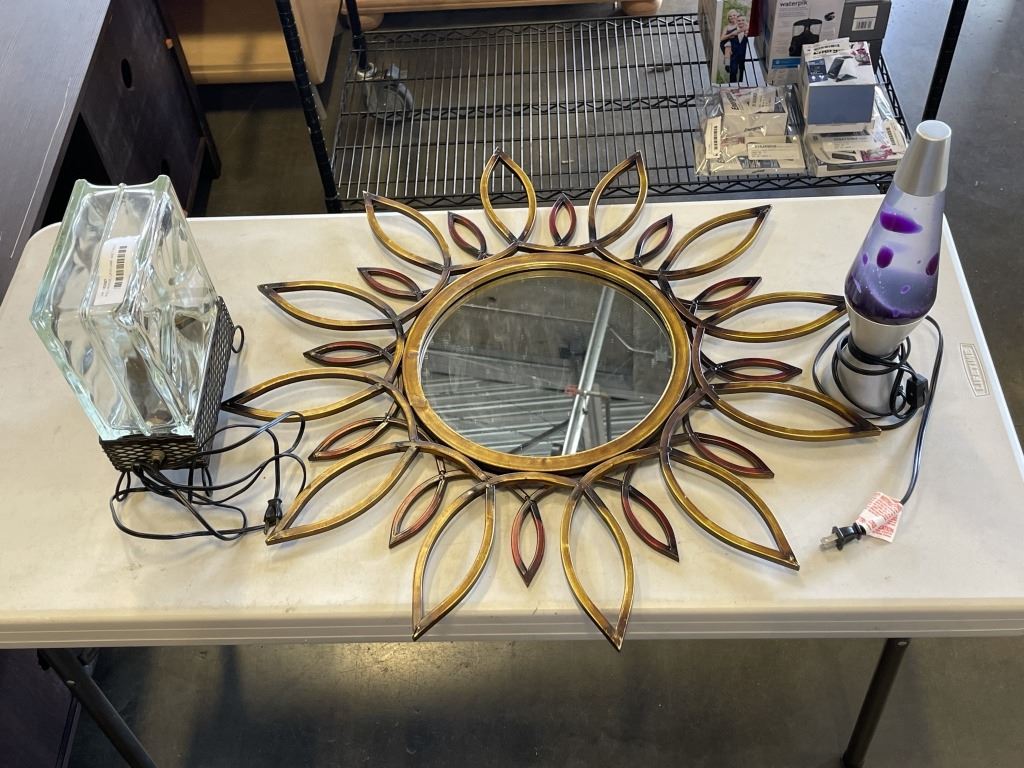 WALL MIRROR, LAVA LAMP, AND TABLE LIGHT