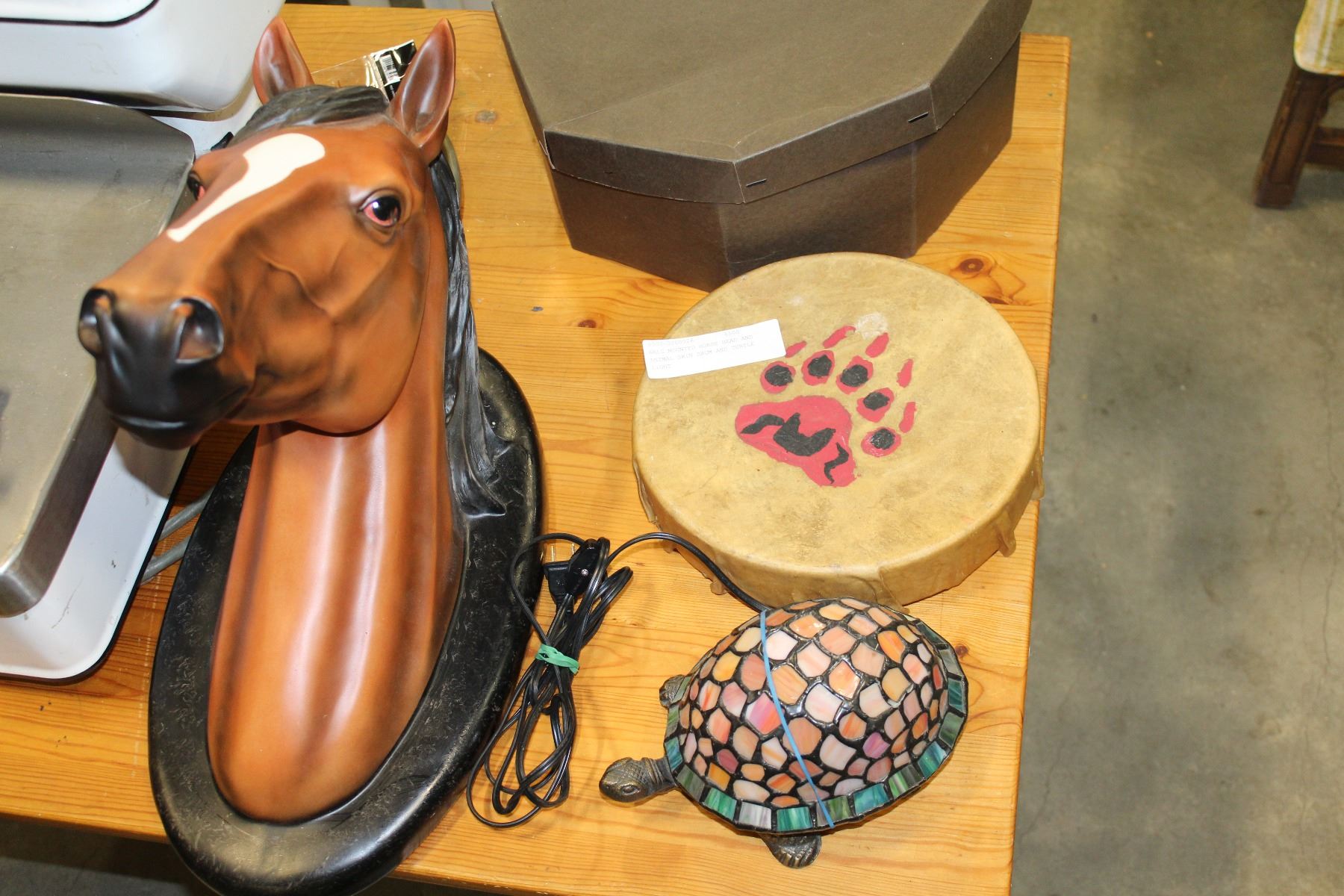 WALL MOUNTED HORSE HEAD AND ANIMAL SKIN DRUM AND TURTLE LIGHT