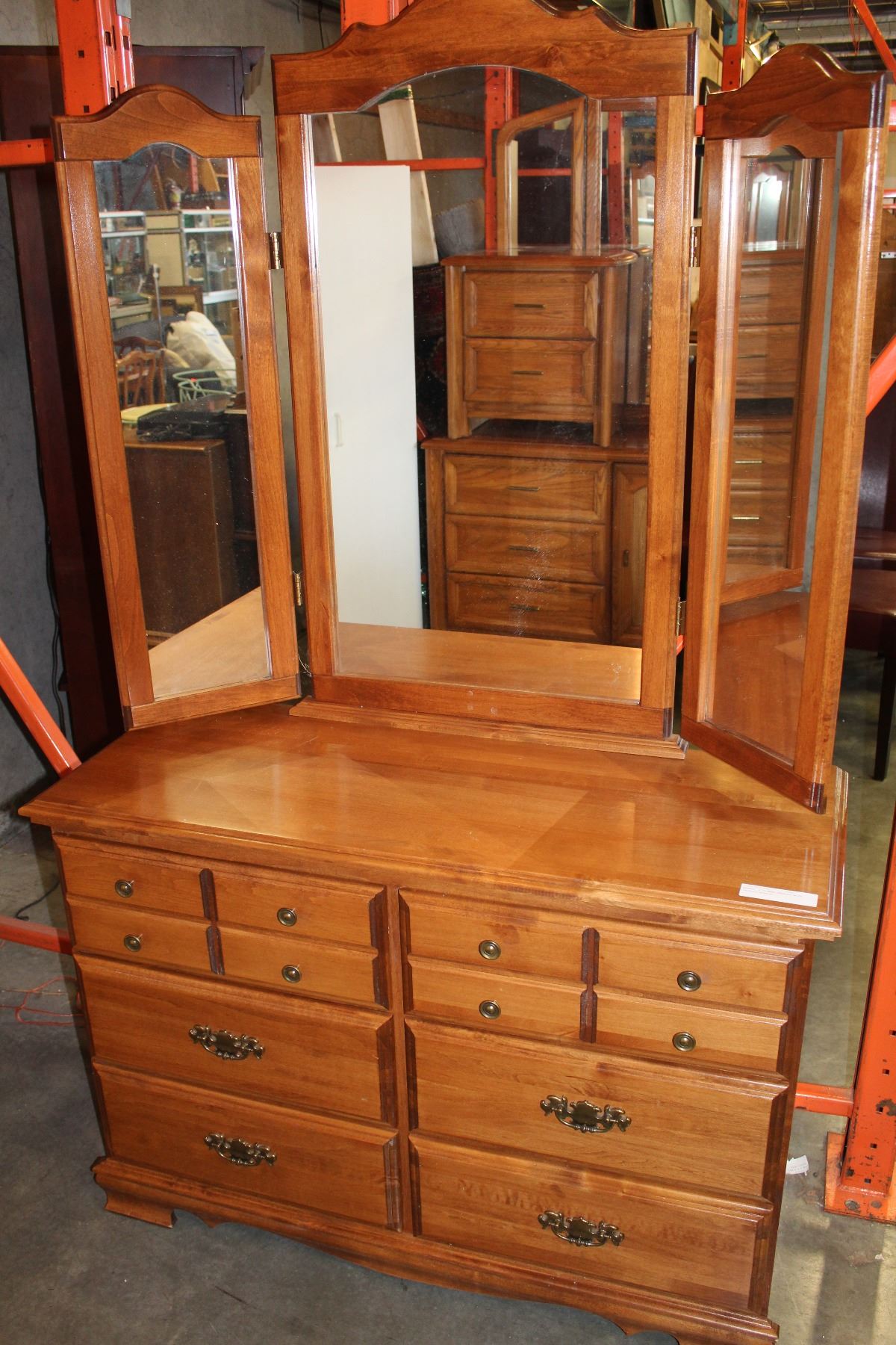 WALNUT 6 DRAWER DRESSER WITH TRIFOLD MIRROR