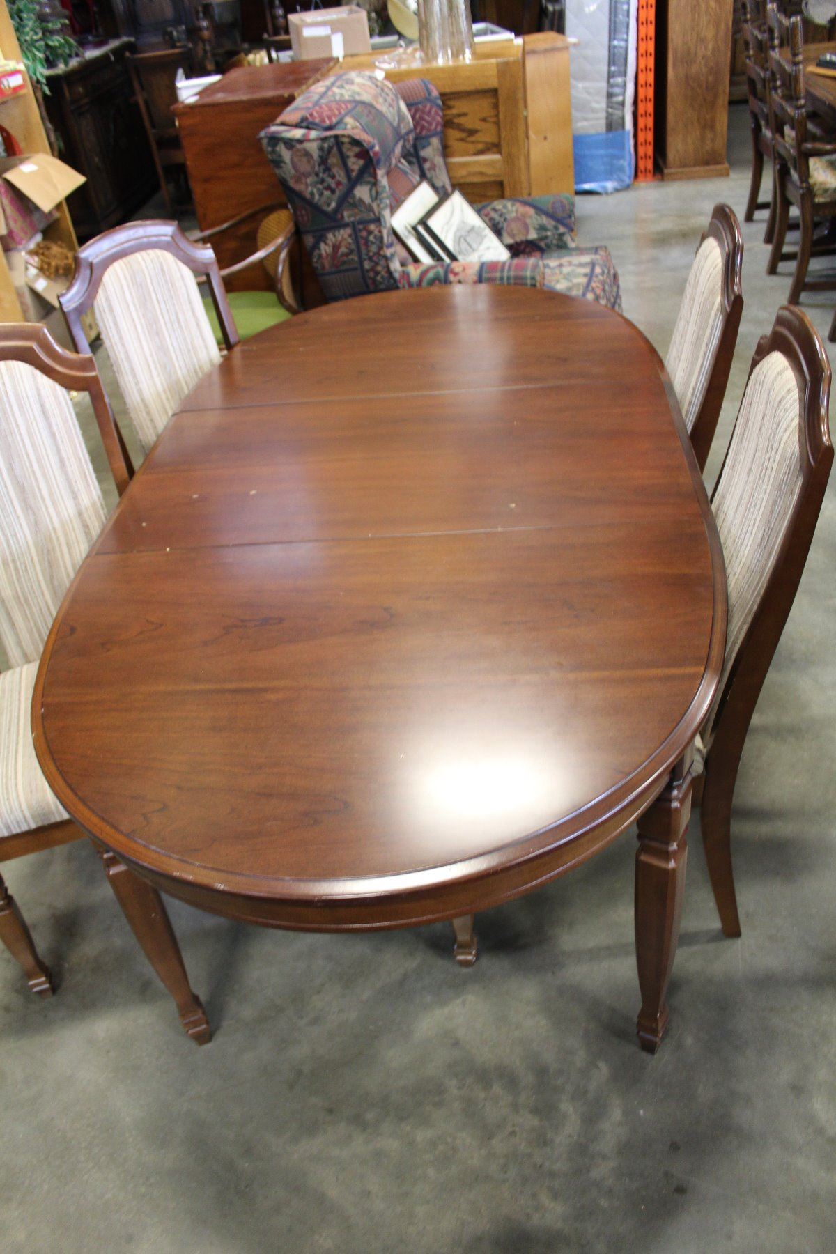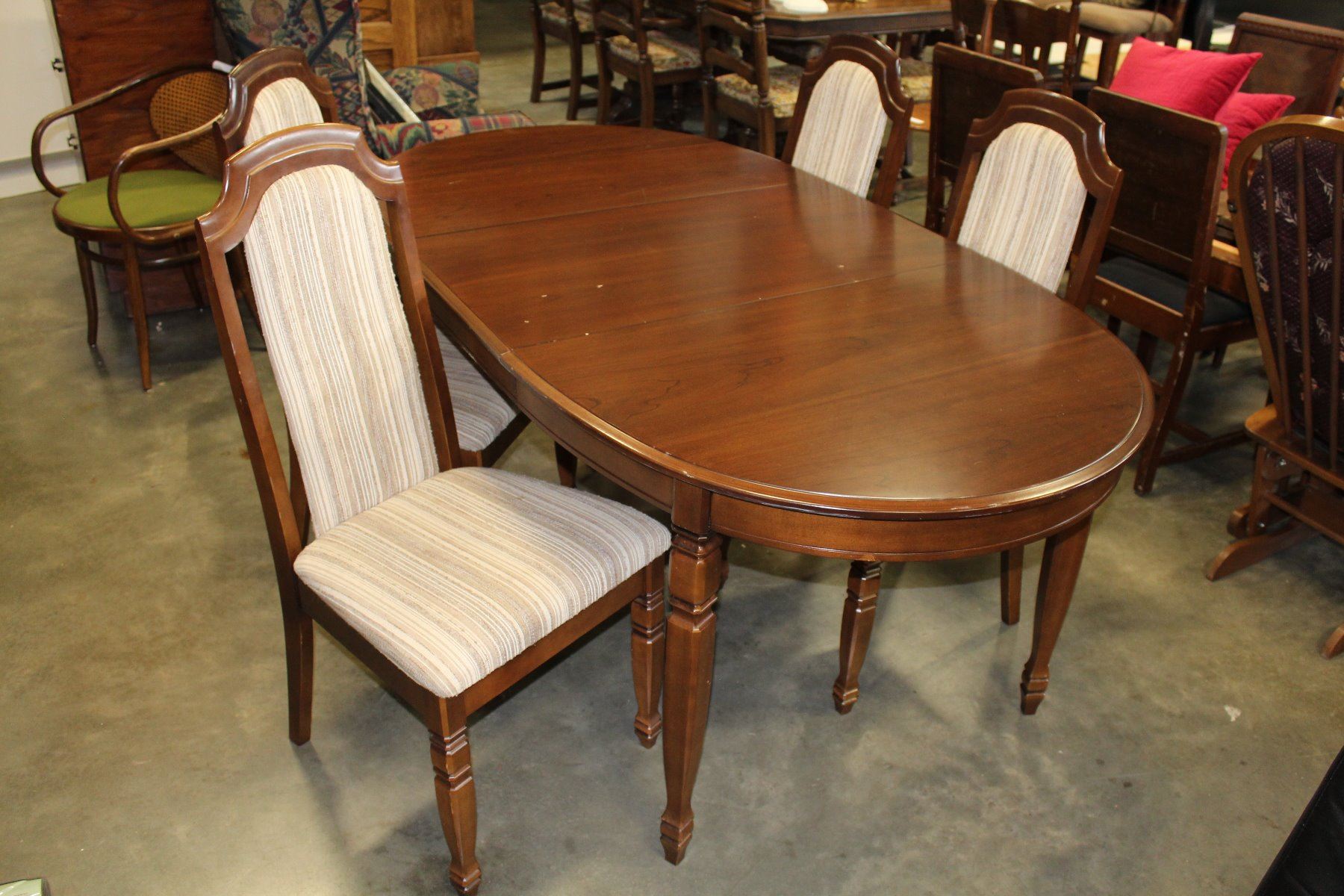 WALNUT DINING TABLE WITH TWO LEAFS AND FOUR UPOLSTERED CHAIRS