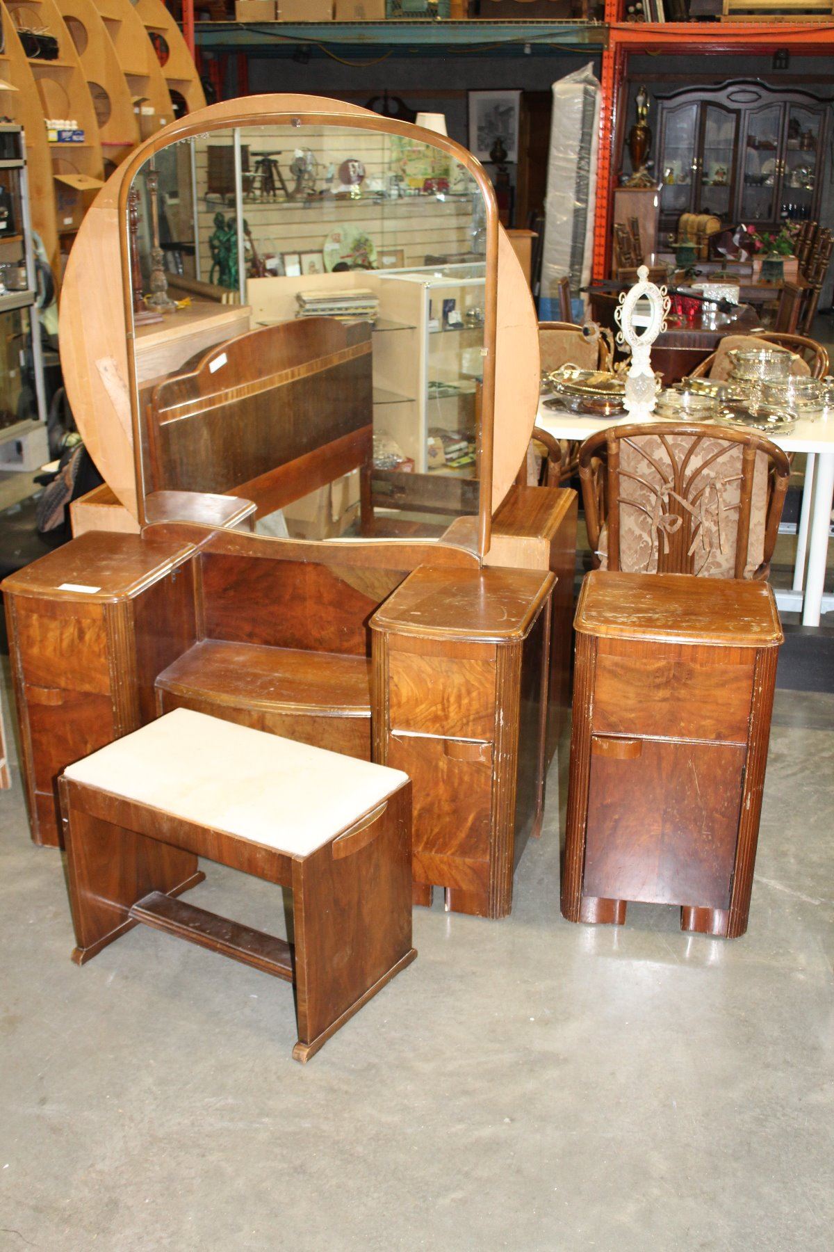 WALNUT VANITY W/ MIRROR AND NIGHTSTAND AND STOOL
