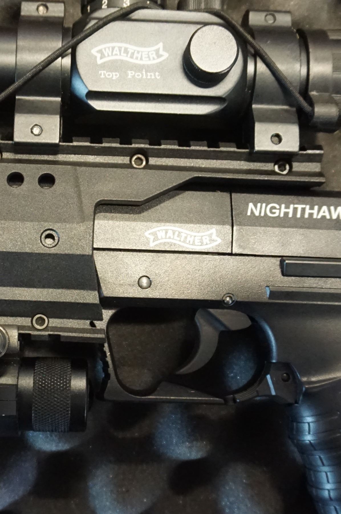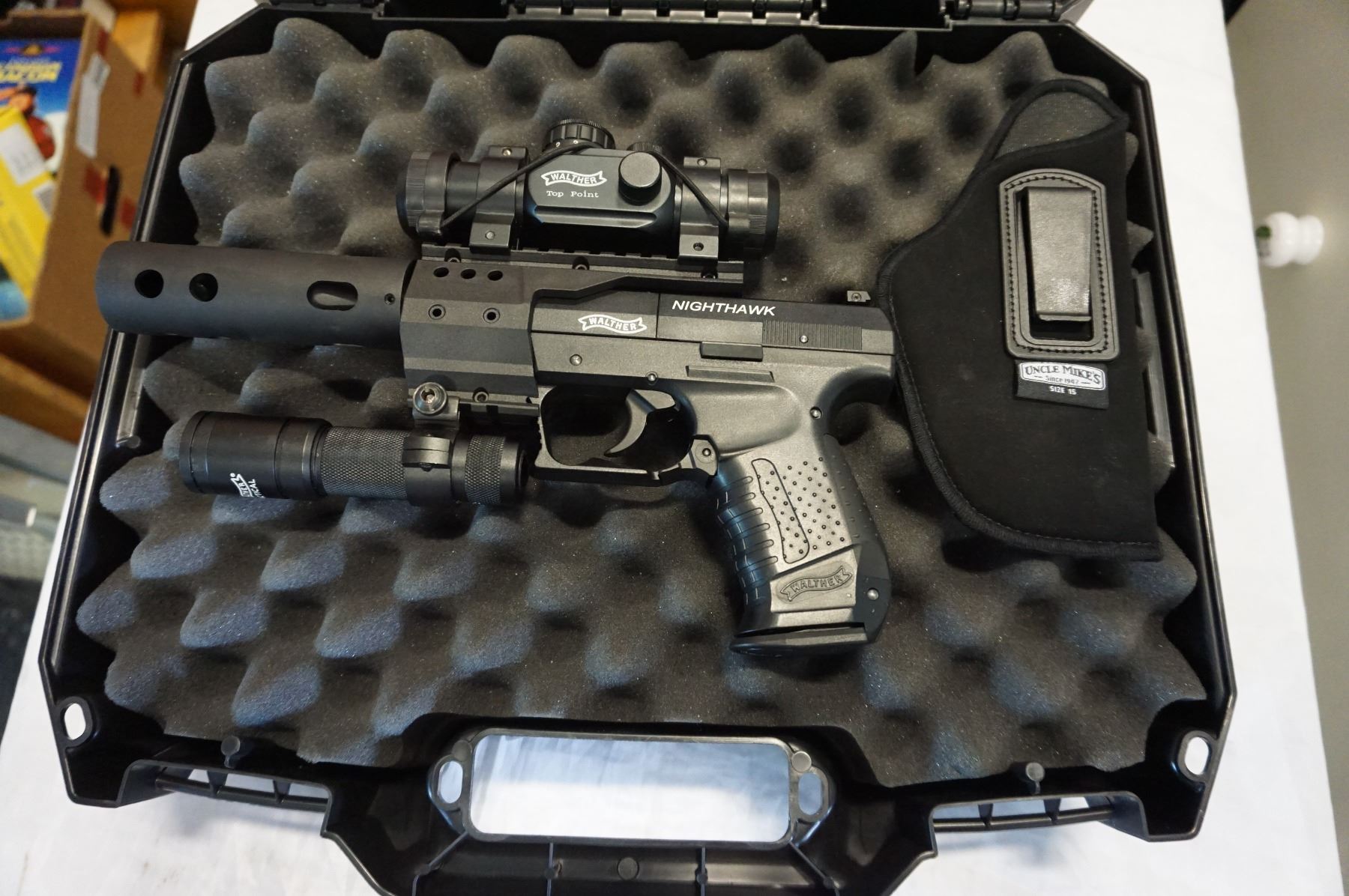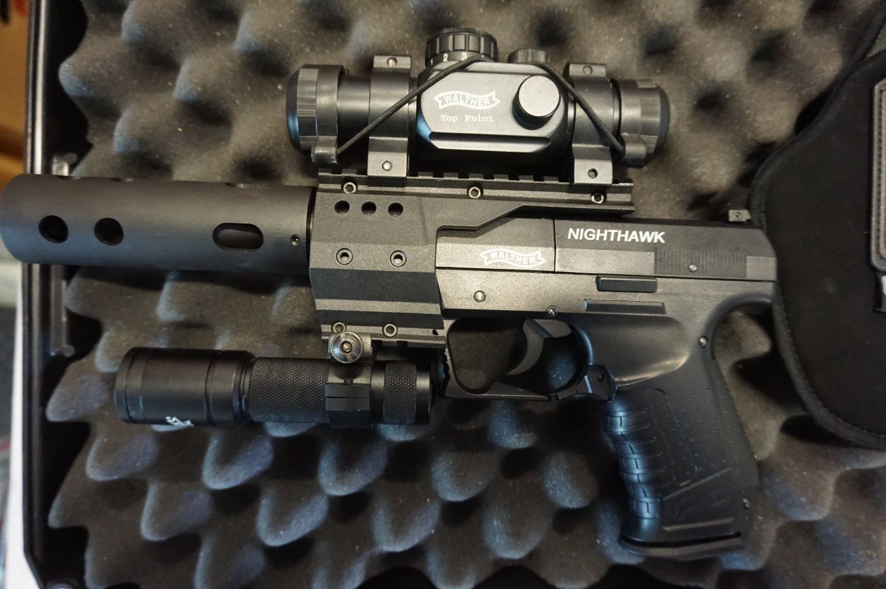 WALTHER NIGHTHAWK CO2 PELLET PISTOL IN HARD CASE WITH ACCESSORIES, RED DOT, FLASHLIGHT, SUPRESSOR