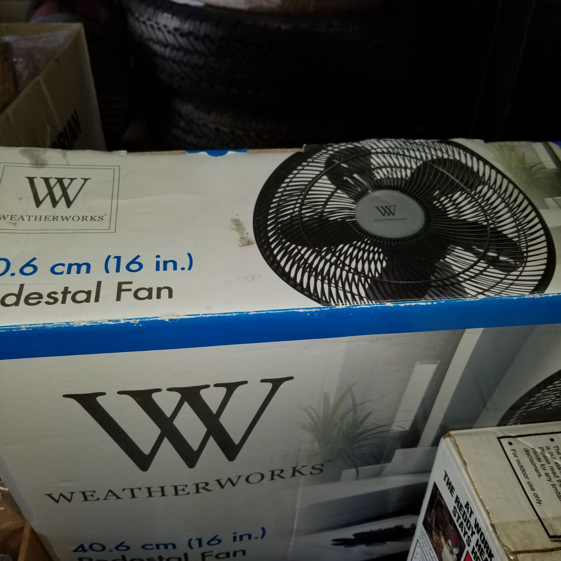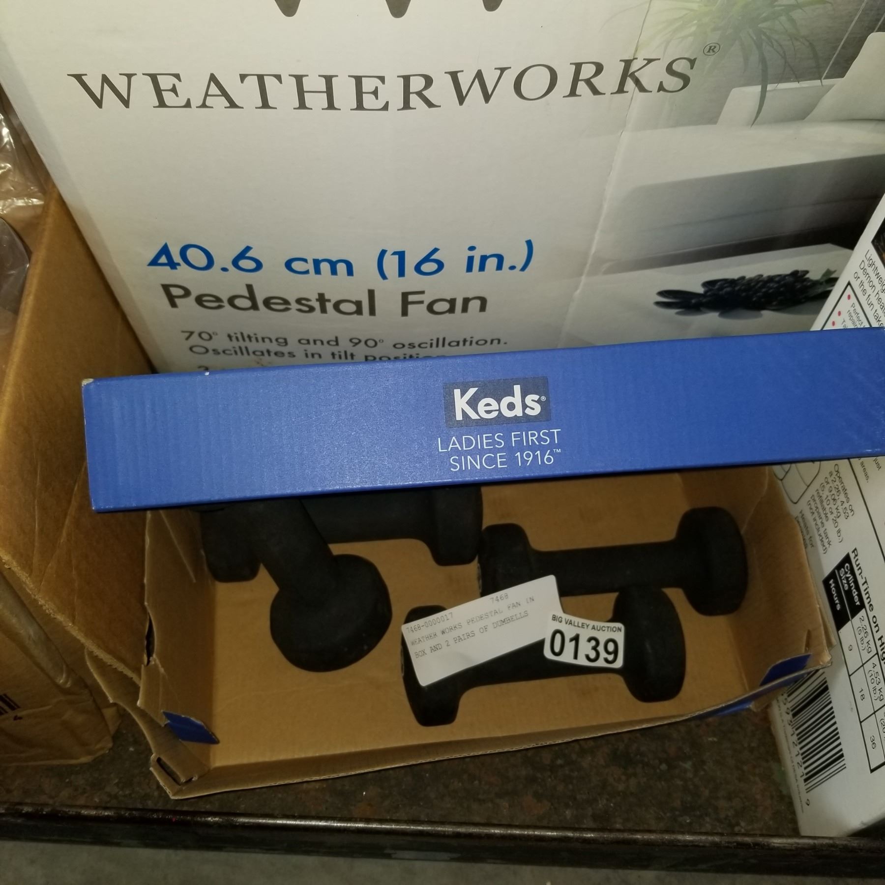 WEATHER WORKS PEDESTAL FAN IN BOX AND 2 PAIRS OF DUMBELLS