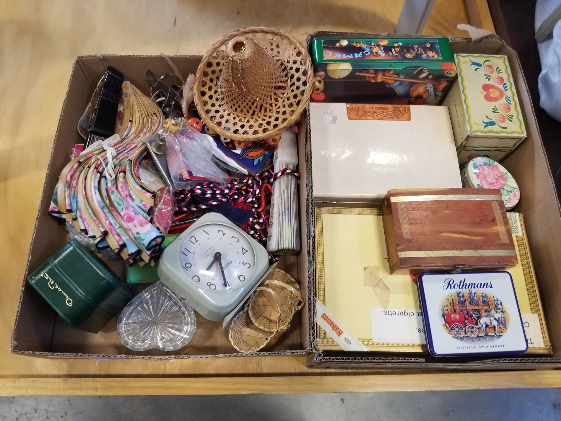 WESTCLOX DRESSER CLOCK, COLLECTABLES, WOOD BOXES, AND TINS