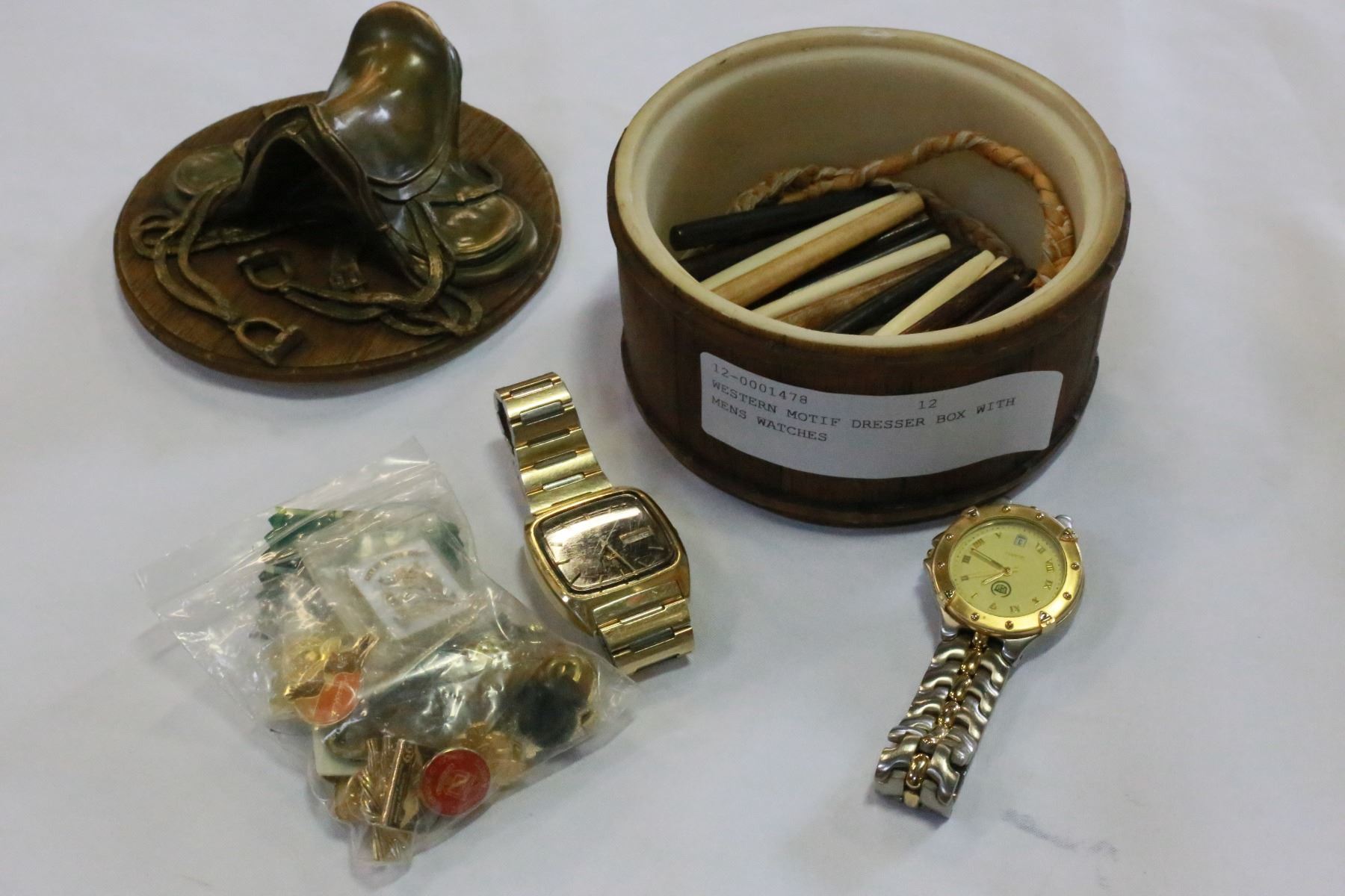 WESTERN MOTIF DRESSER BOX WITH MENS WATCHES
