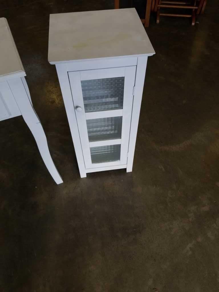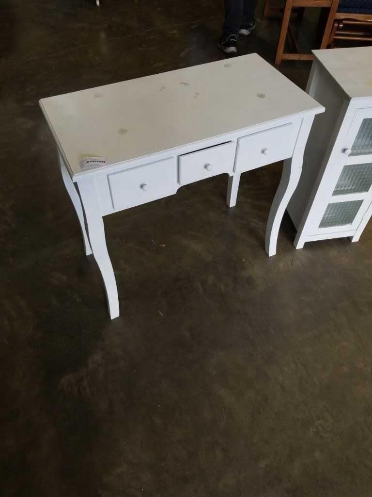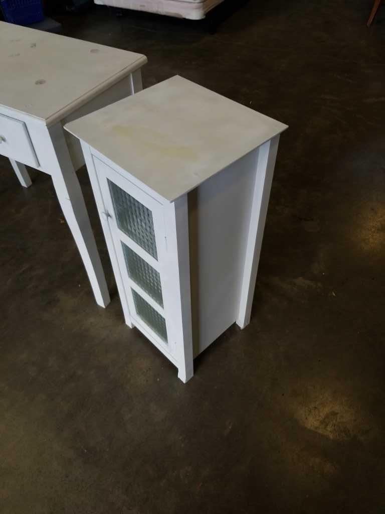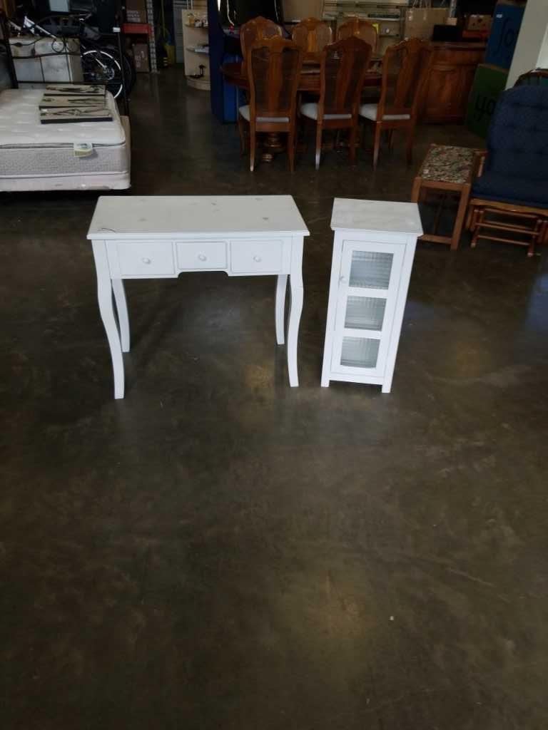 WHITE 3 DRAWER DESK AND GLASS DOOR CABINET