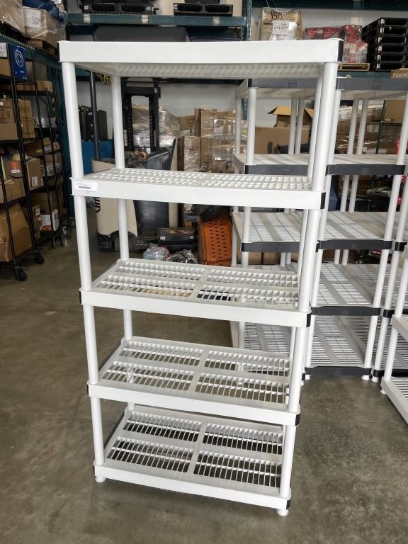 WHITE 4 TIER PLASTIC SHELVING UNIT APPROX 6FT TALL, 36" x 18"