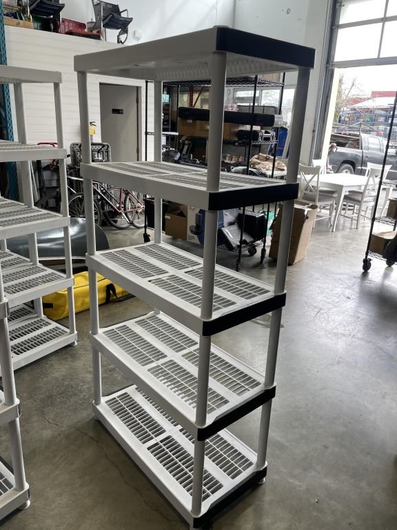 WHITE 4 TIER PLASTIC SHELVING UNIT APPROX 6FT TALL, 36" x 18"
