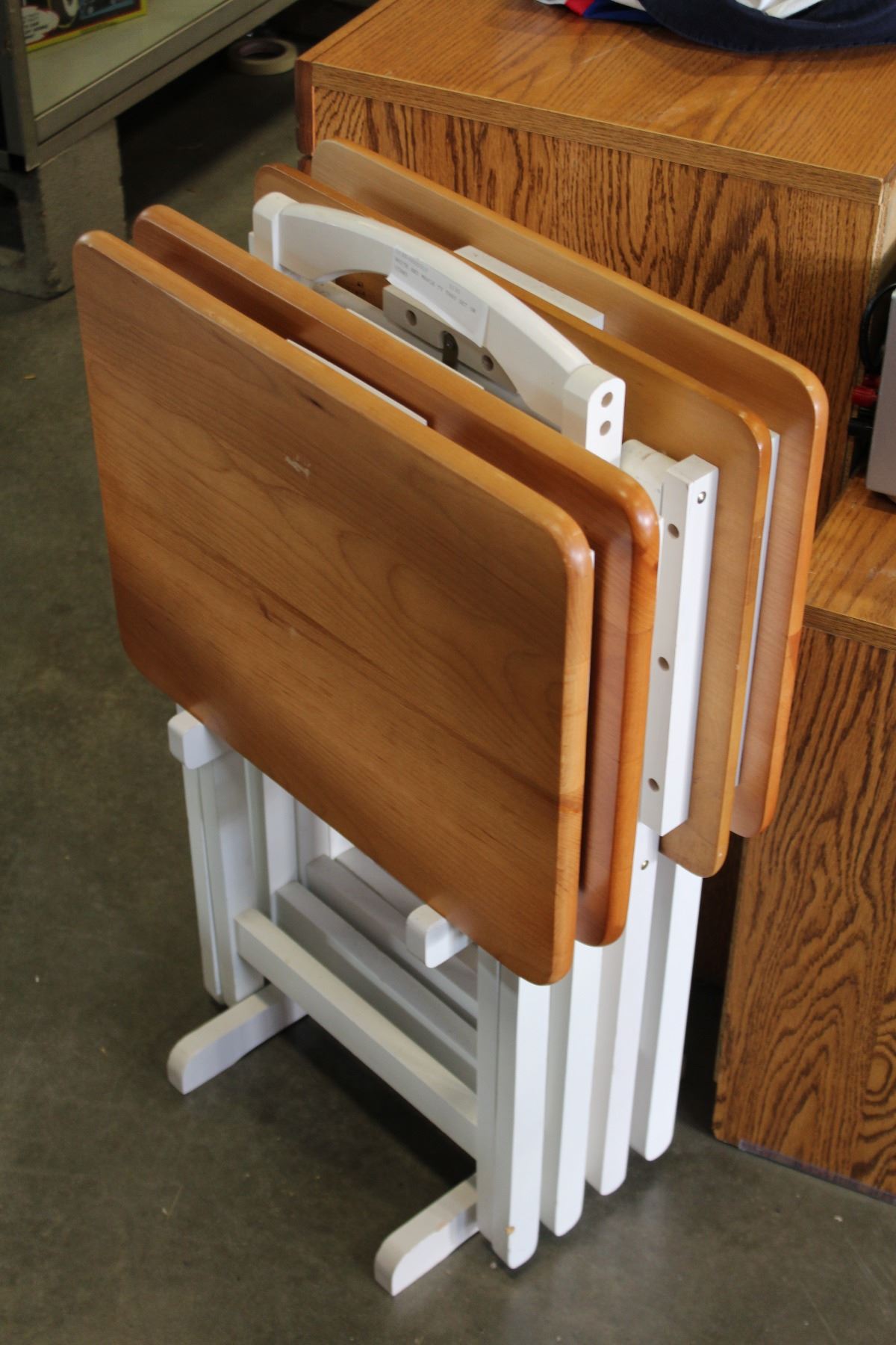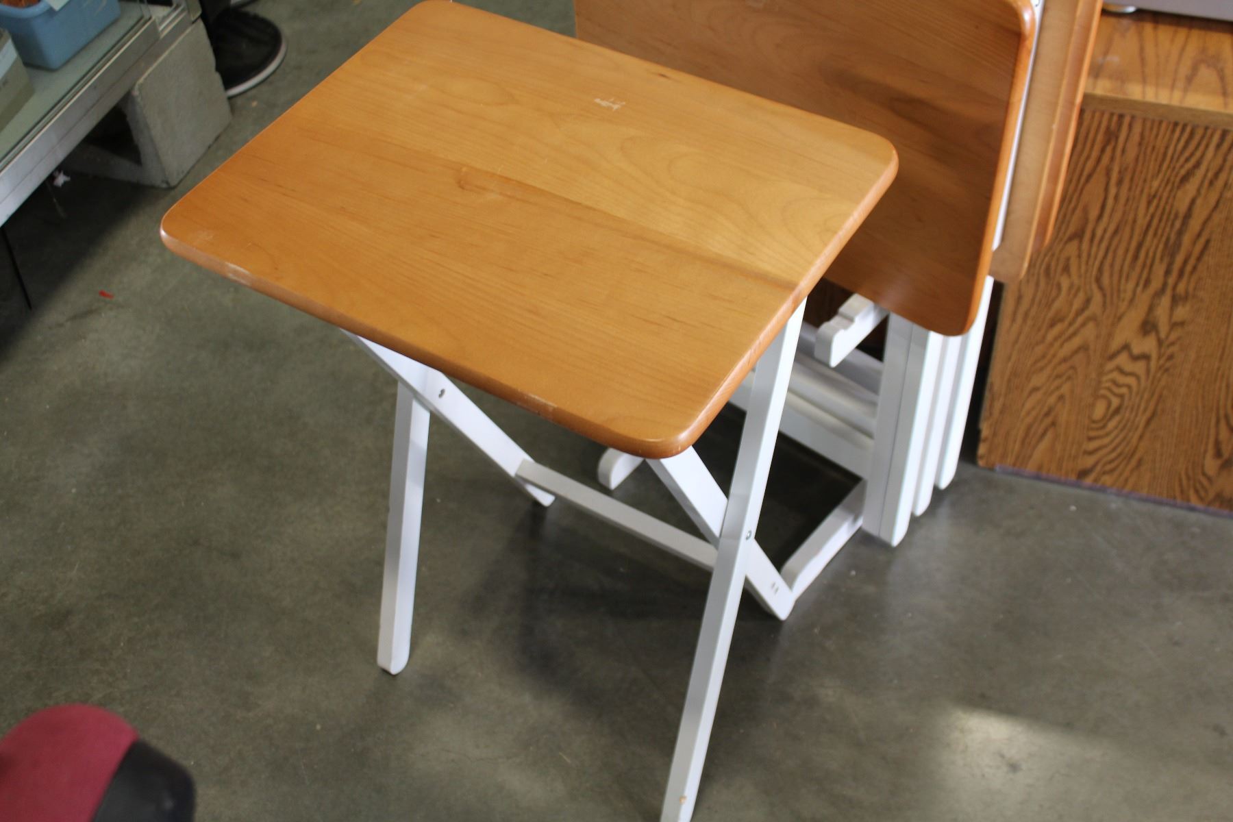 WHITE AND MAPLE TV TRAY SET ON STAND