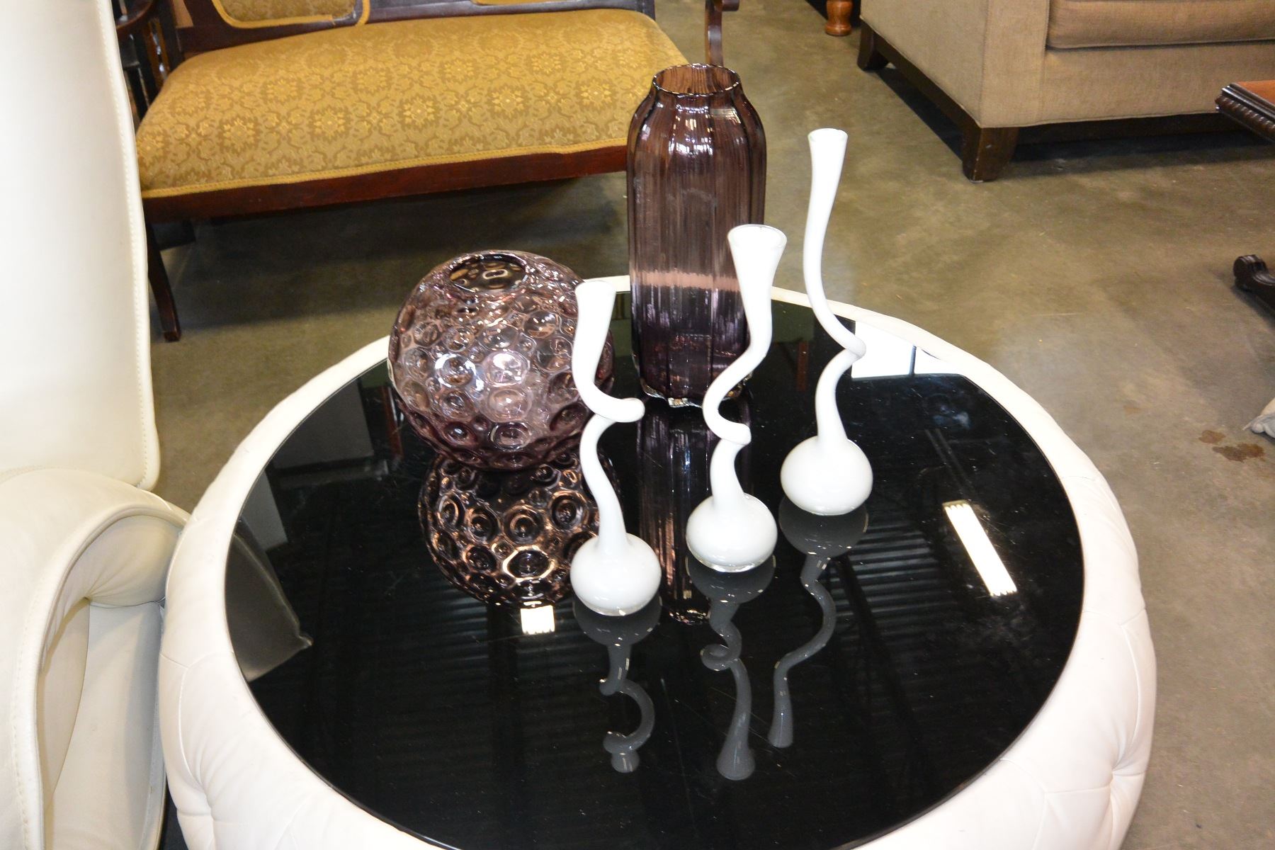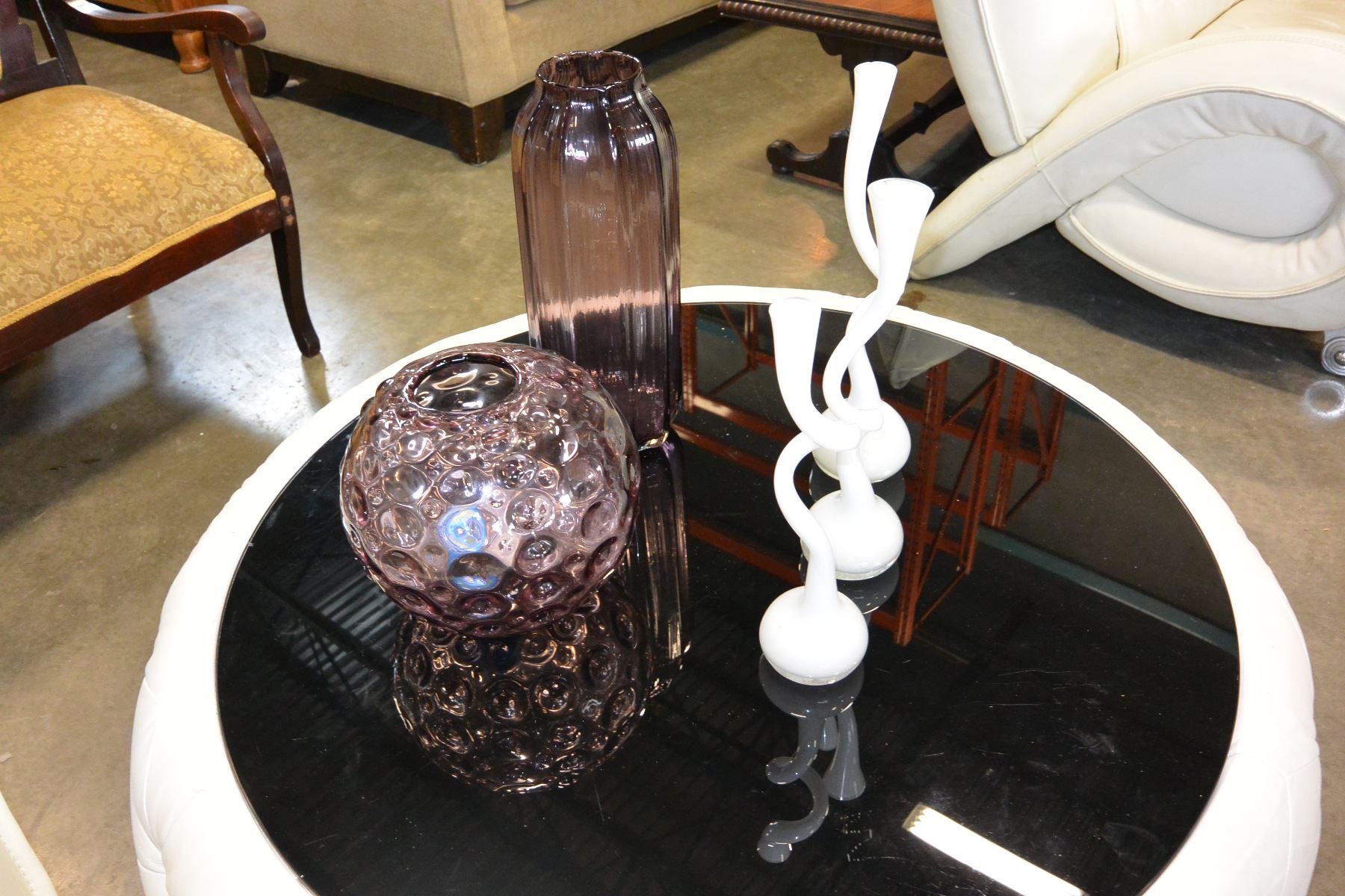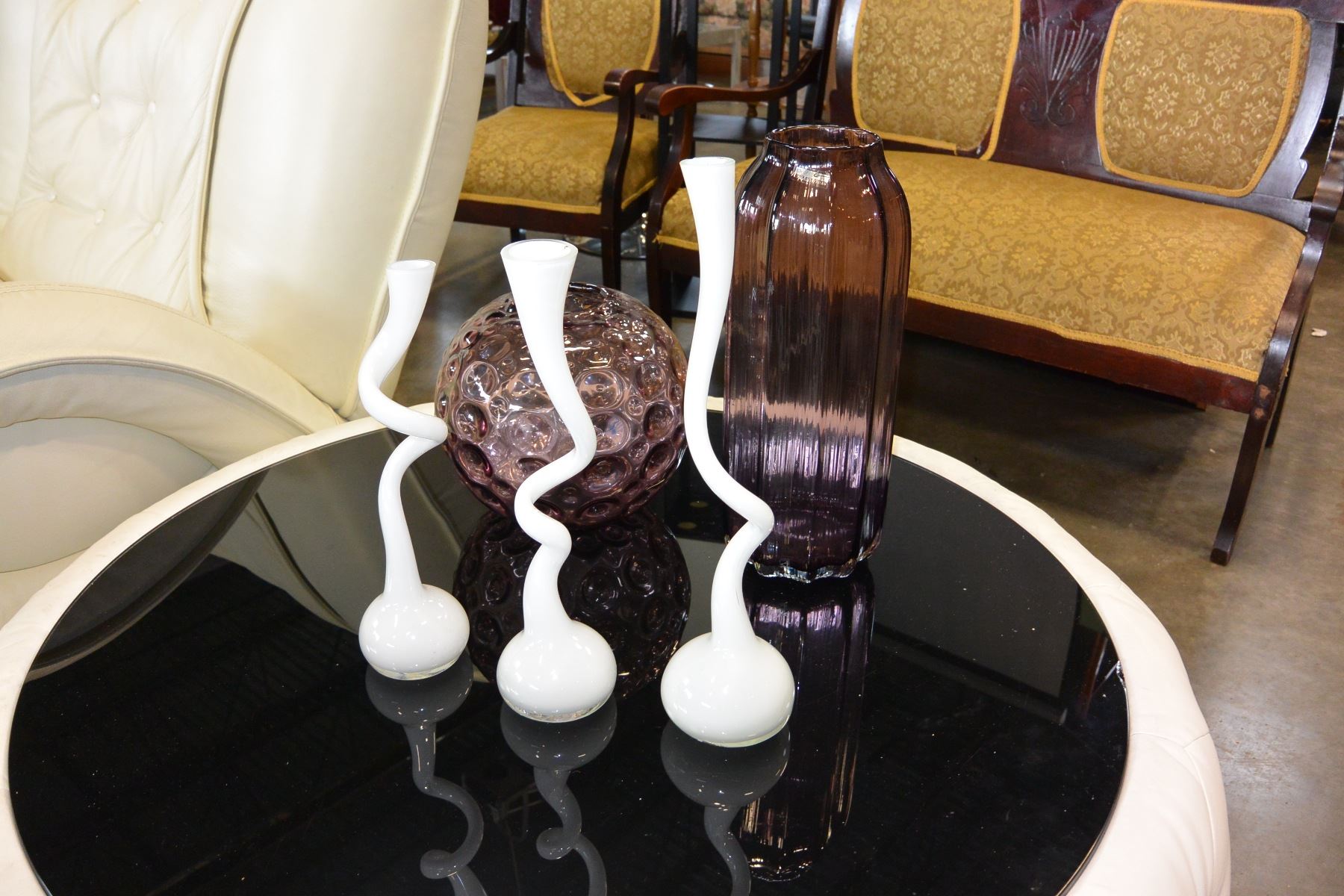 WHITE ART GLASS VASES AND PURPLE GLASS VASES