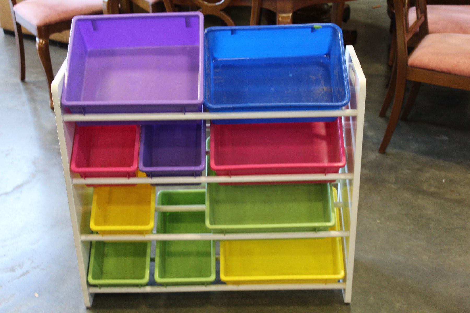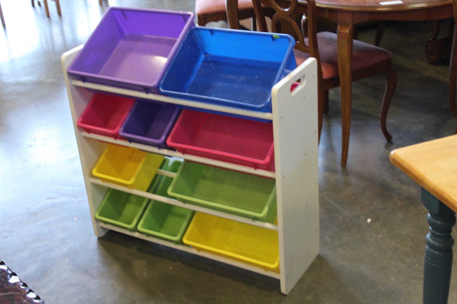 WHITE CRAFTS SHELF WITH COLORED BASKETS